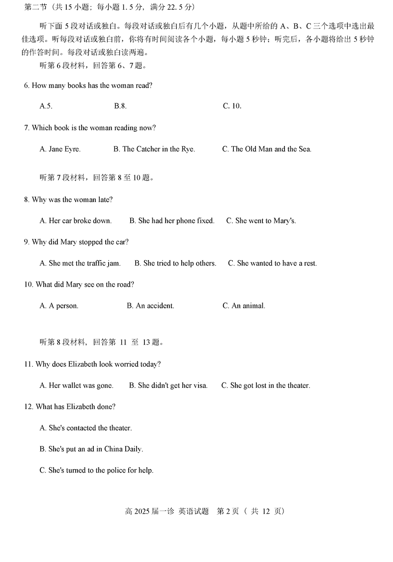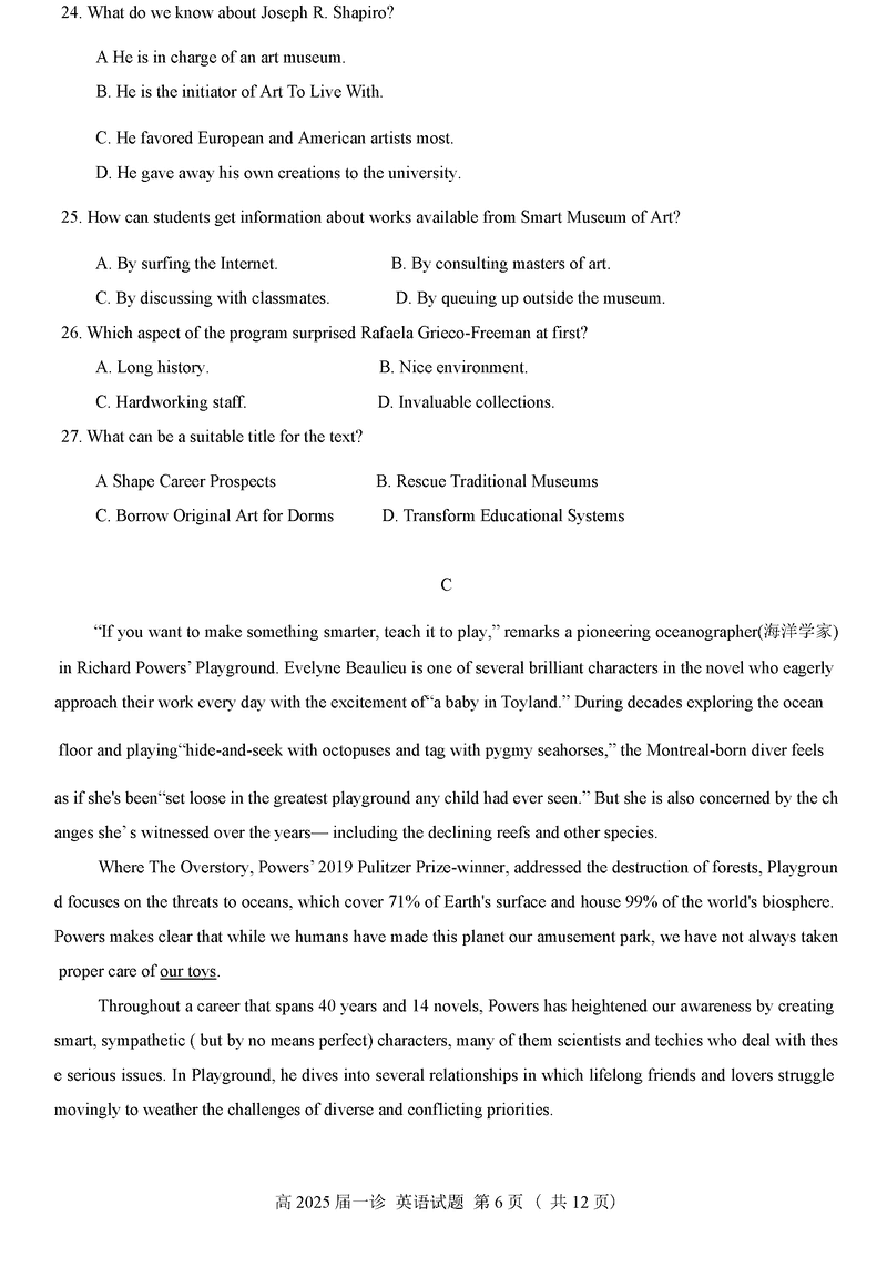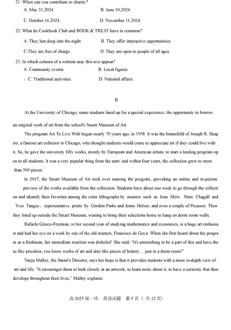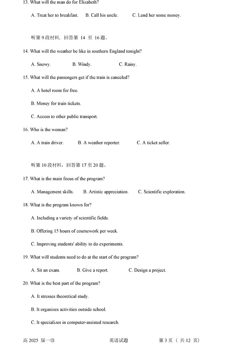 四川自贡普高2025届高三第一次诊断性考英语试题及答案