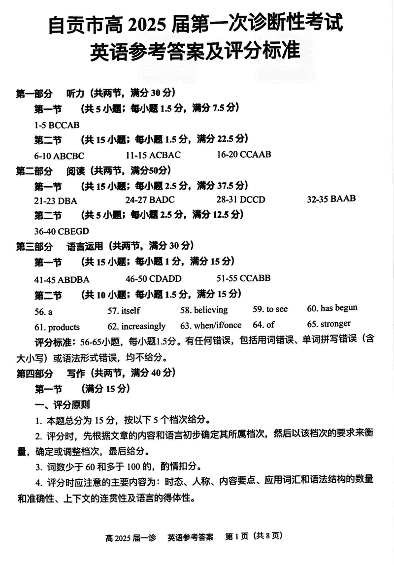 四川自贡普高2025届高三第一次诊断性考英语考试已于近日开考,为方便考生考后及时查看考试情况,查漏补缺、弥补不足,本文整理了试题答案解析相关信息!