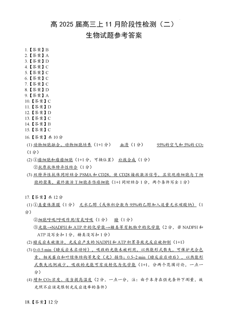 重庆西南大学附中2025届高三上学期11月阶段性检测(二)生物考试已于近日开考,为方便考生考后及时查看考试情况,查漏补缺、弥补不足,本文整理了试题答案解析相关信息!