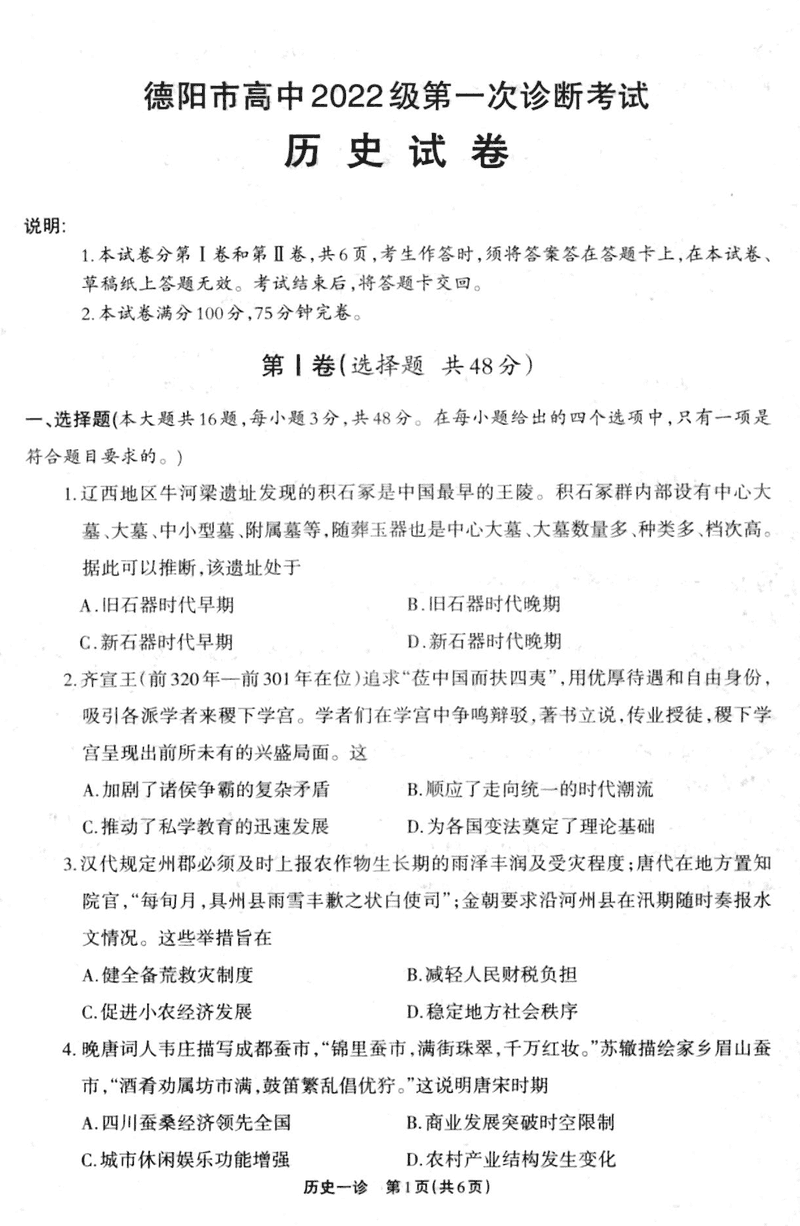 德阳一诊2025届高三第一次诊断考试历史试题及答案 时间:2024-12-05 17:16 四川 文综试题 德阳一诊2025届高三第一次诊断历史考试已于近日开考,为方便考生考后及时查看考试情况,查漏补缺、弥补不足,本文整理了试题答案解析相关信息! 汇总:德阳一诊2025届高三第一次诊断考试试题及答案汇总 历史试题及答案解析