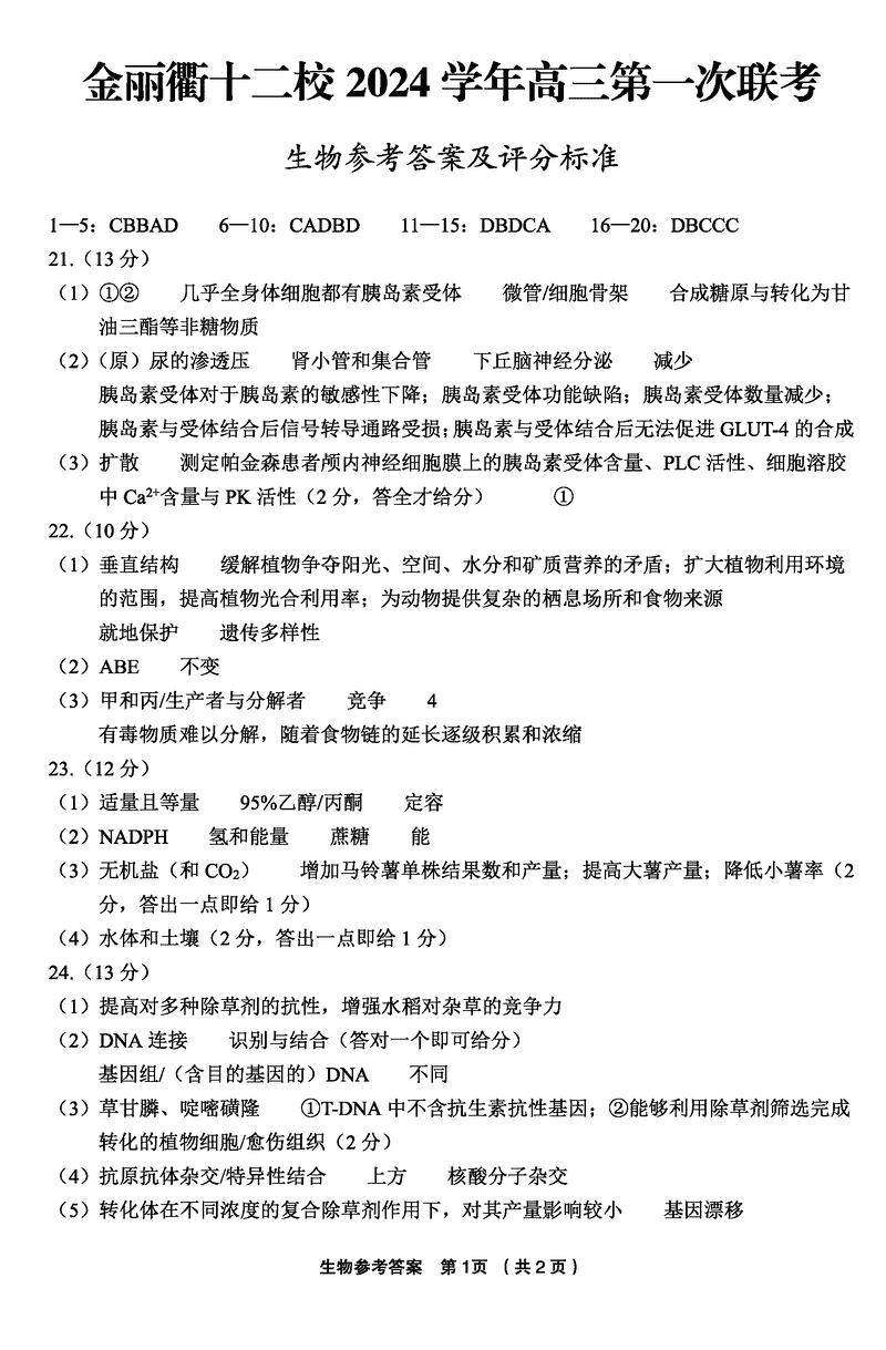 金丽衢十二校2024年高三上学期第一次联考生物试题及答案