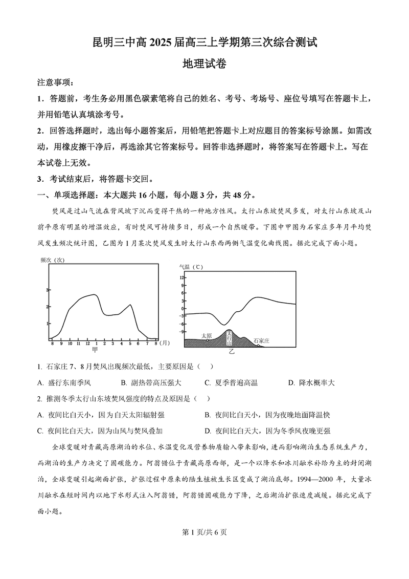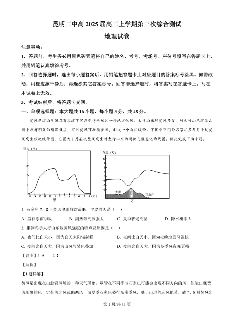 昆明三中2024-2025学年高三上学期11月月考地理试题及答案