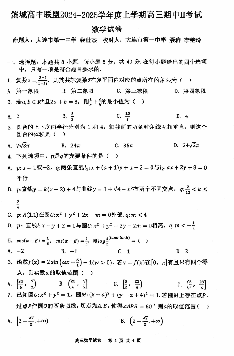 大连滨城高中联盟2025届高三上学期期中Ⅱ数学试题及答案