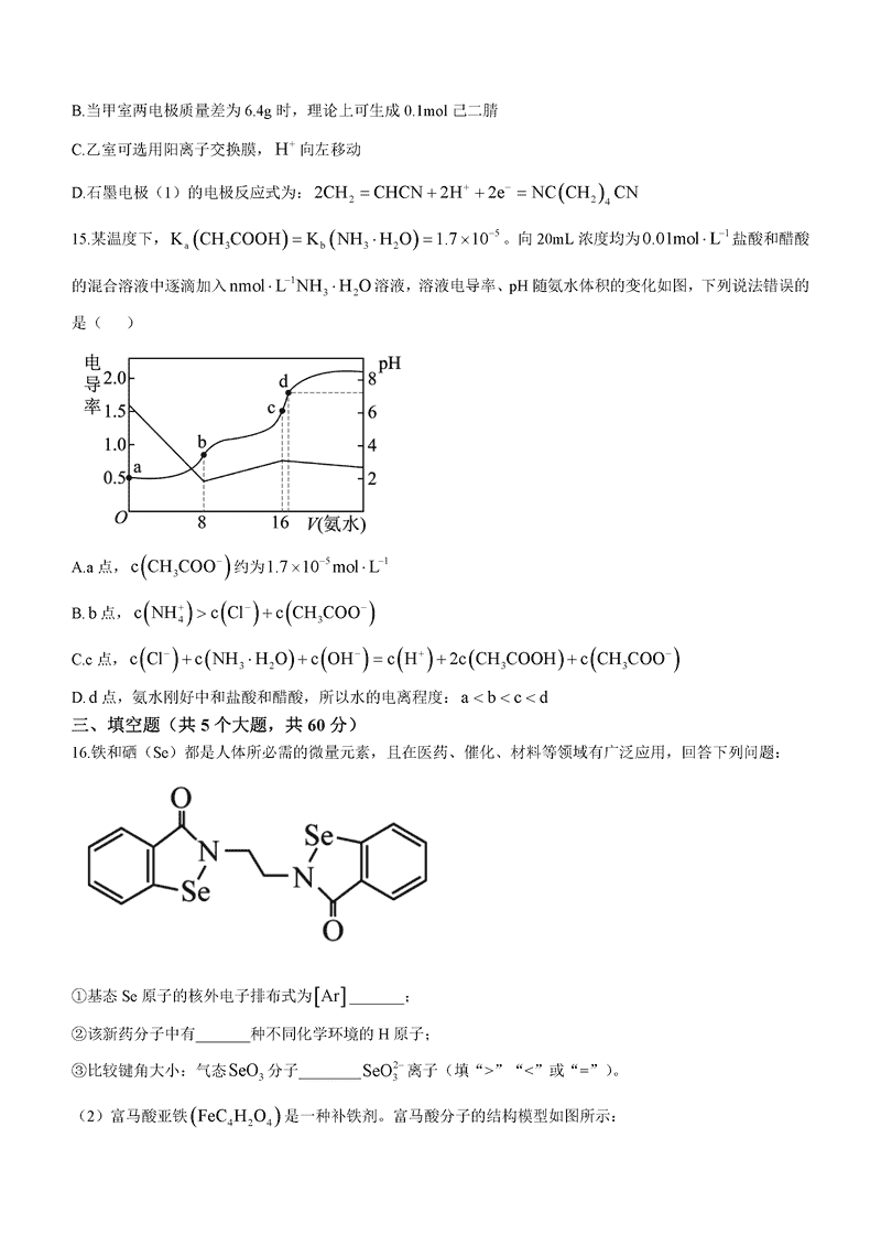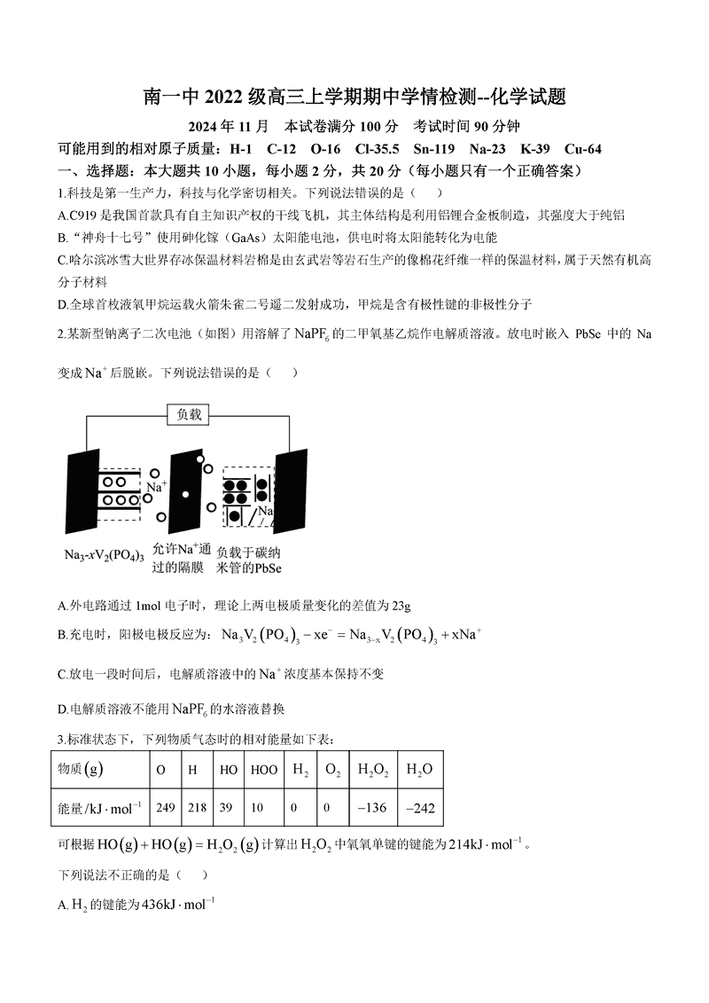 济南一中2025届高三上学期期中学情检测化学试题及答案