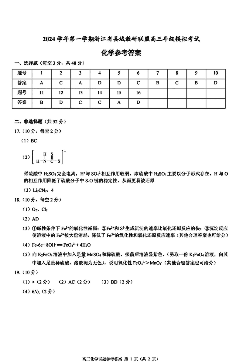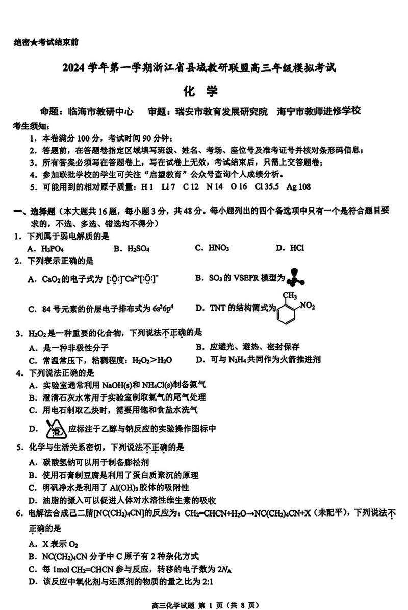 浙江县域教研联盟2025届高三上学期摸底考化学考试已于近日开考,为方便考生考后及时查看考试情况,查漏补缺、弥补不足,本文整理了试题答案解析相关信息!
