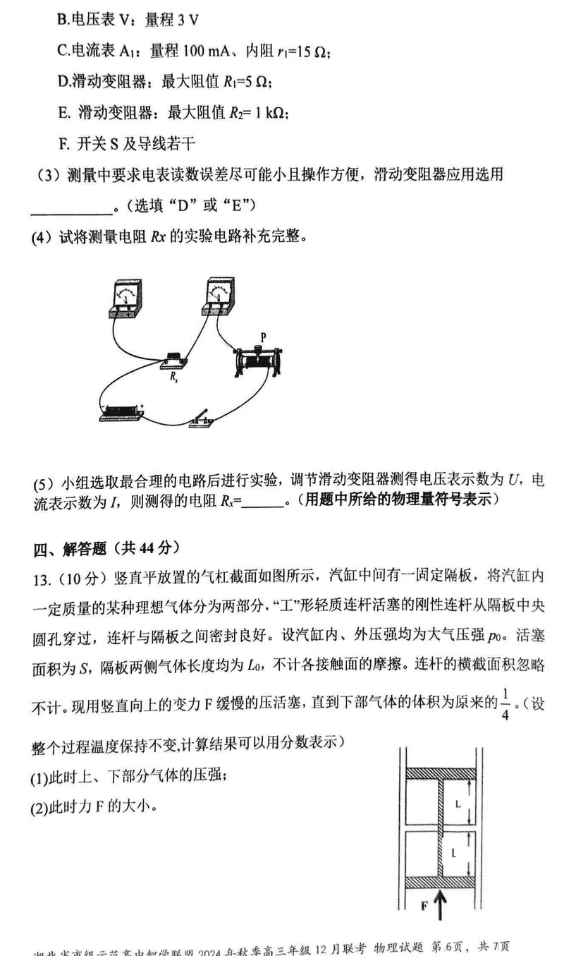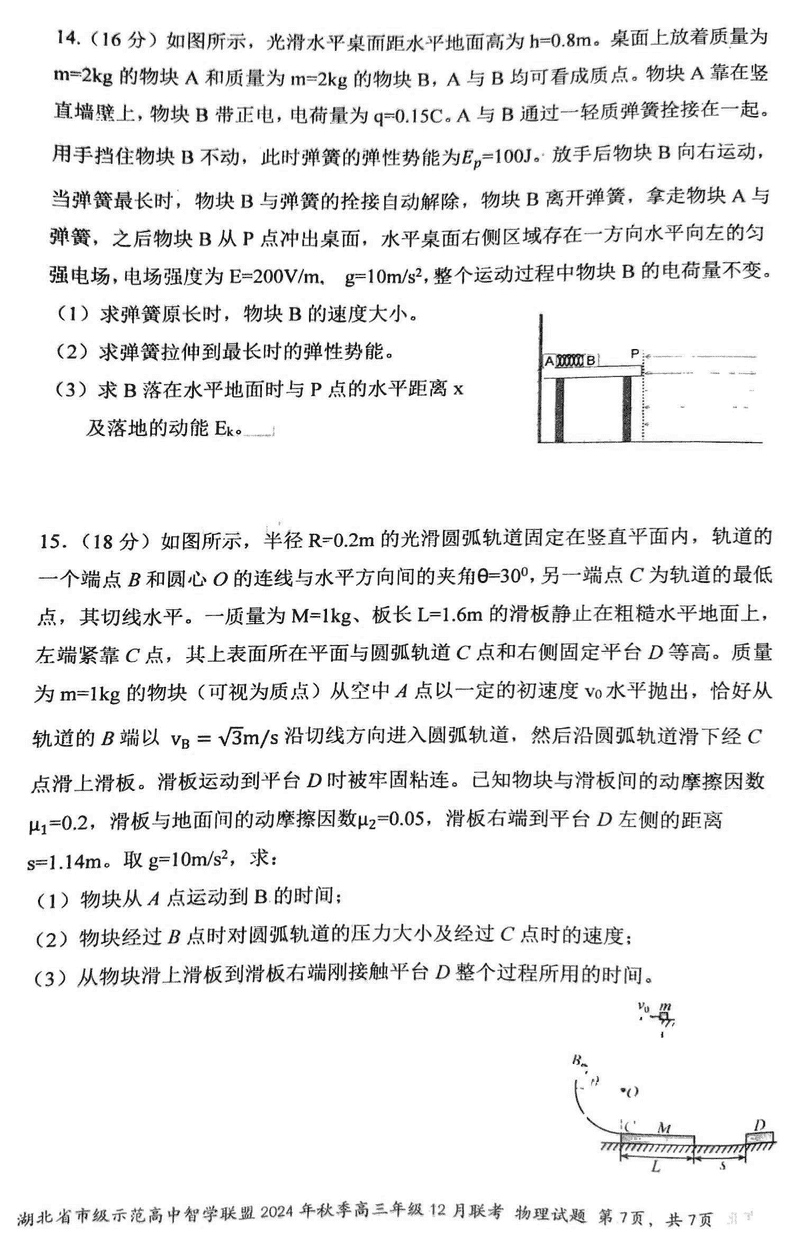 湖北智学联盟2024年秋季高三12月联考物理试题及答案