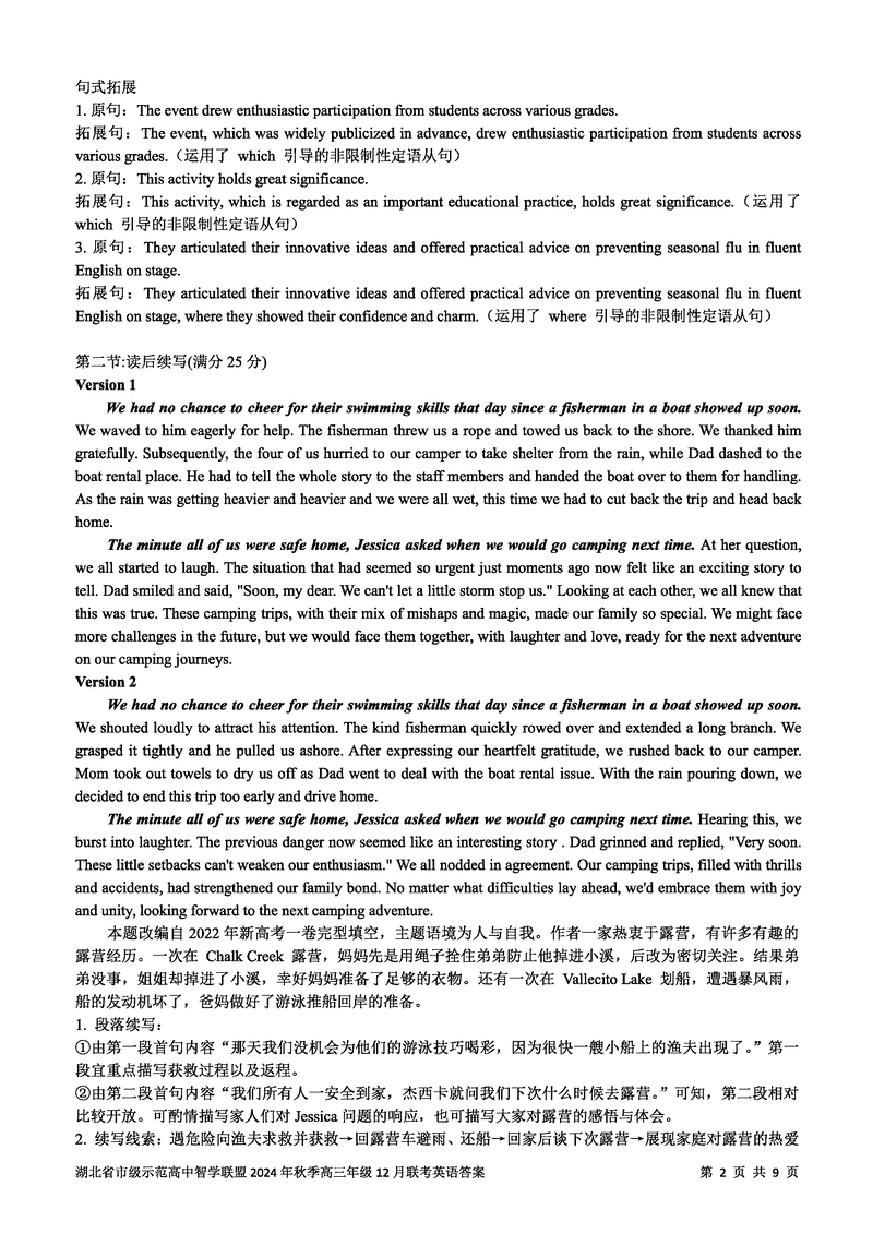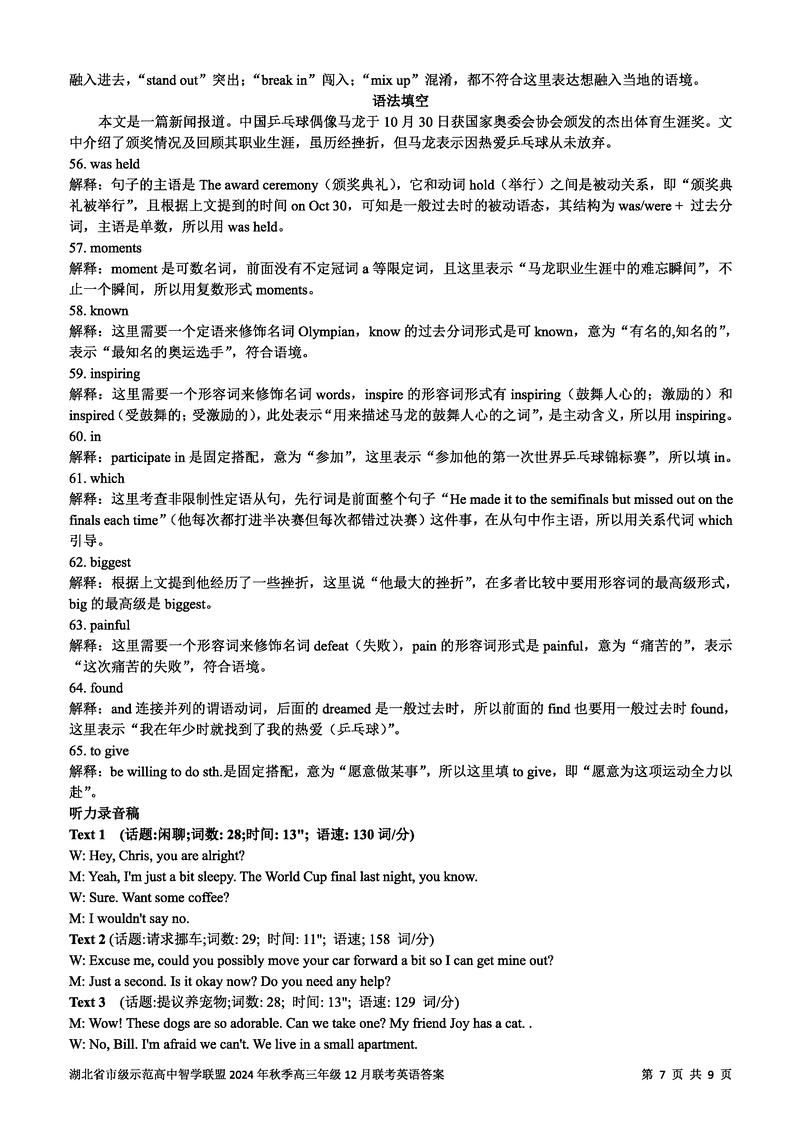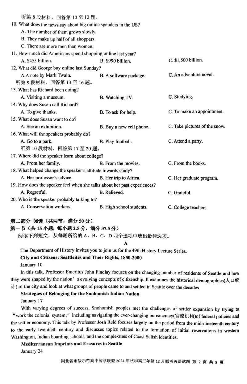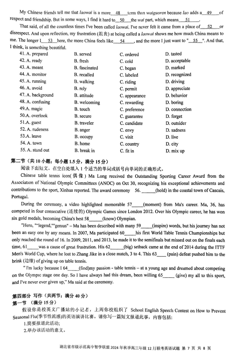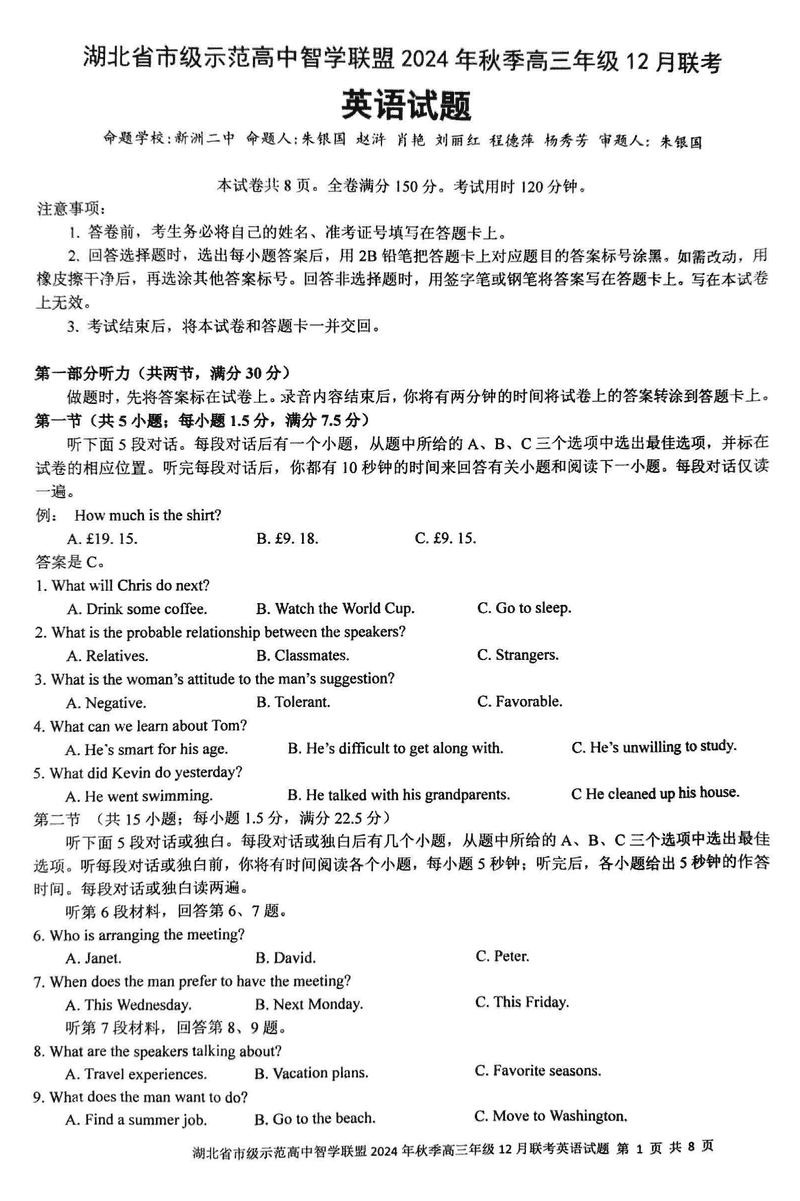 湖北智学联盟2024年秋季高三12月联考英语考试已于近日开考,为方便考生考后及时查看考试情况,查漏补缺、弥补不足,本文整理了试题答案解析相关信息!