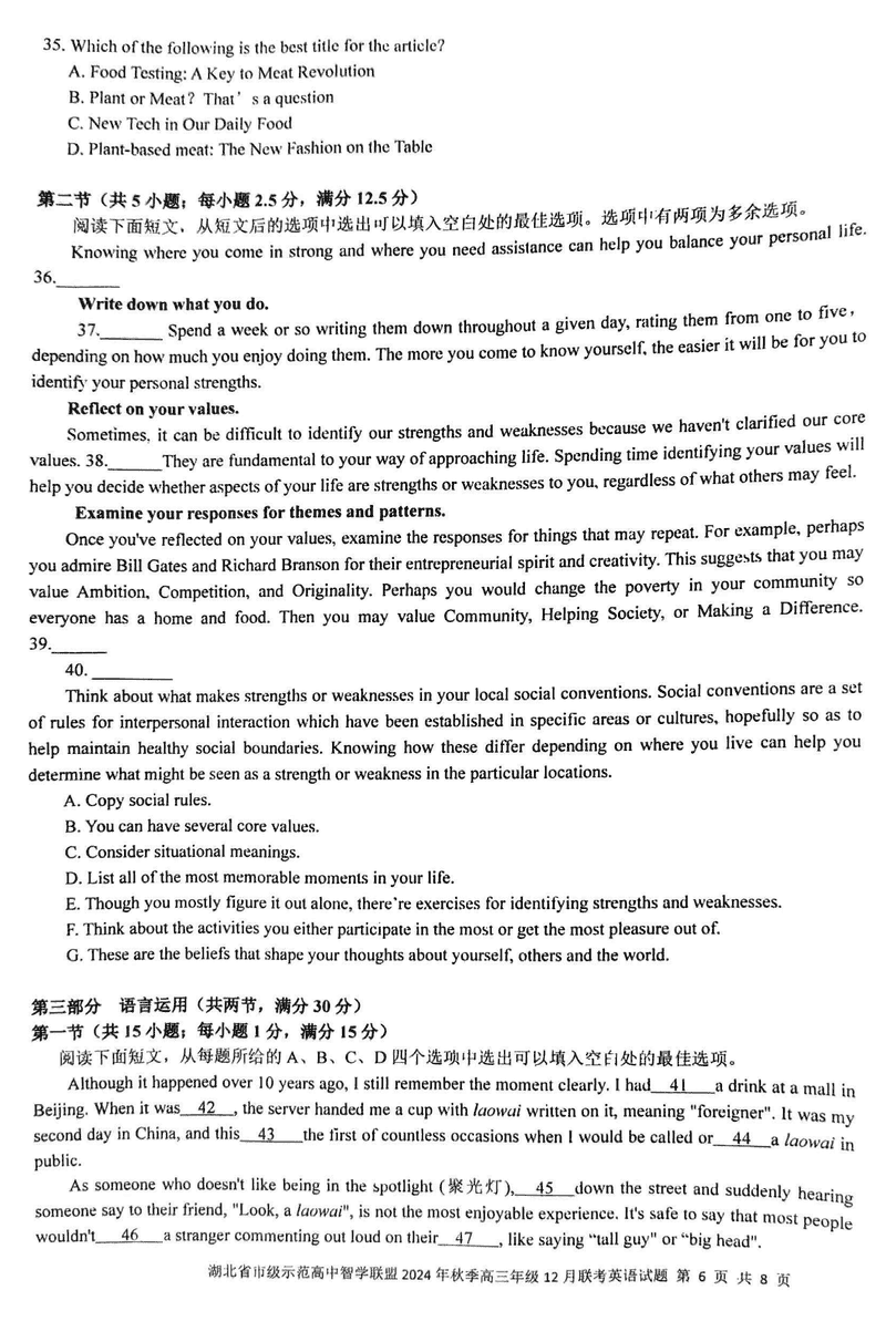 湖北 英语试题