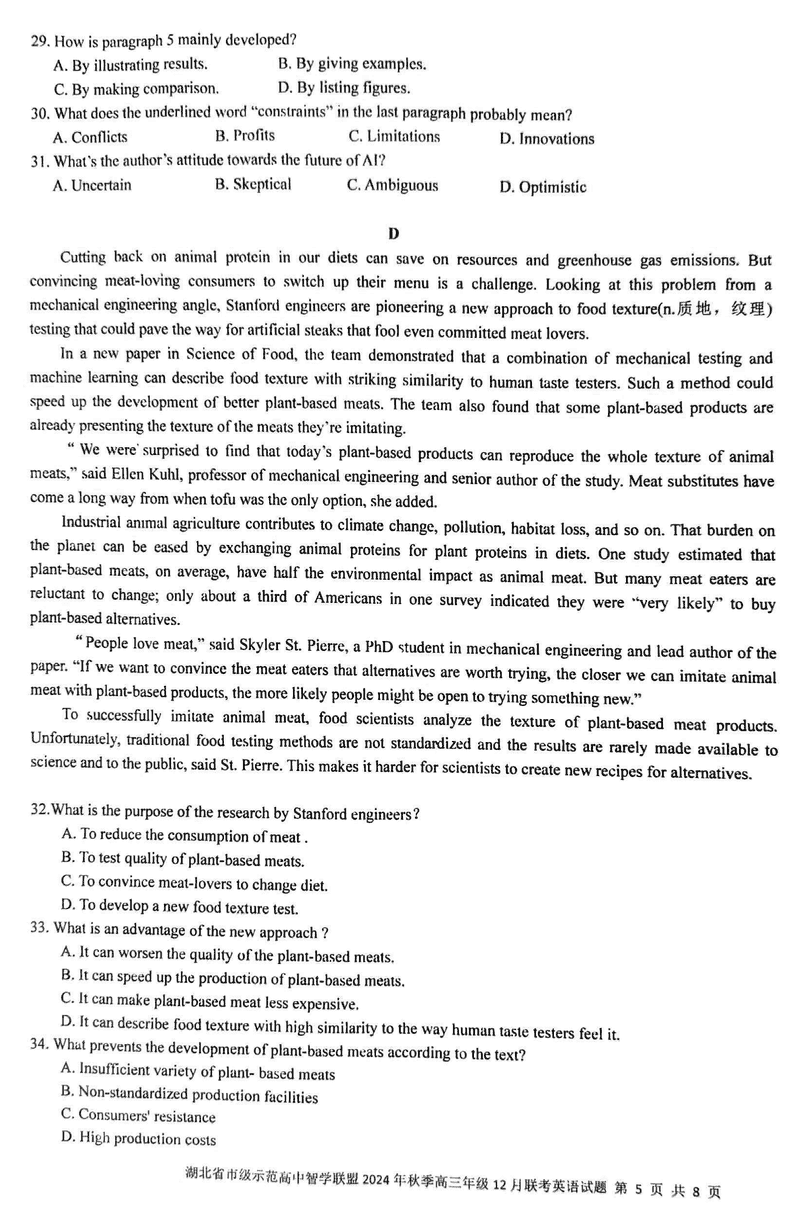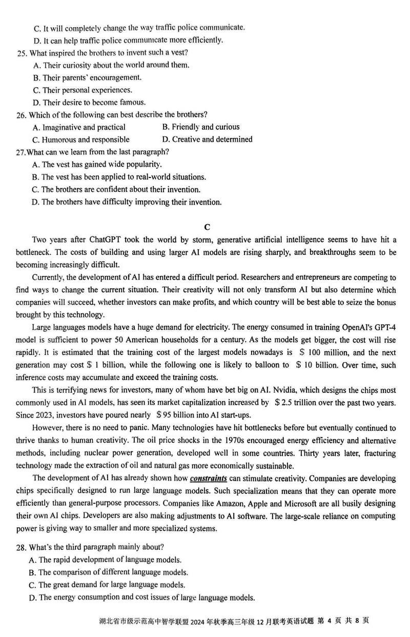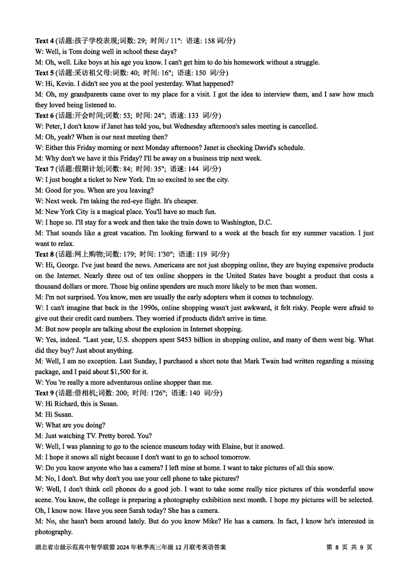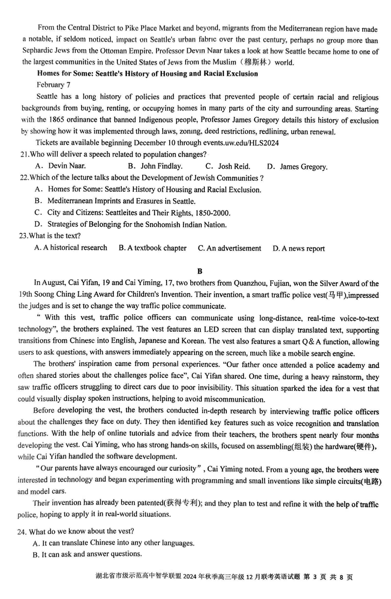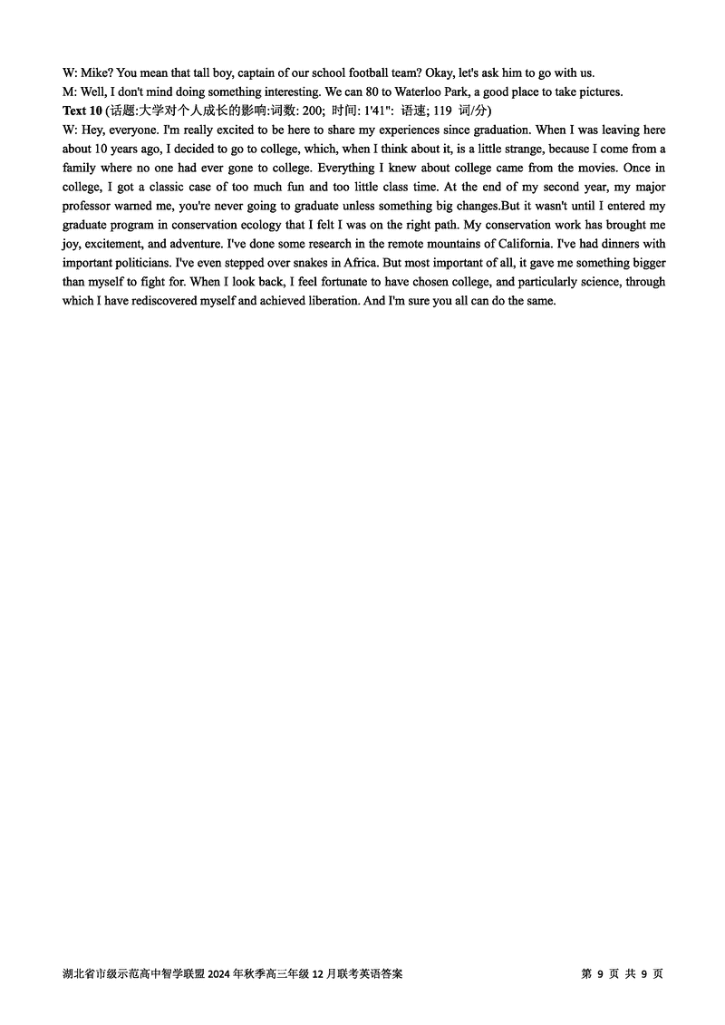 湖北智学联盟2024年秋季高三12月联考英语试题及答案