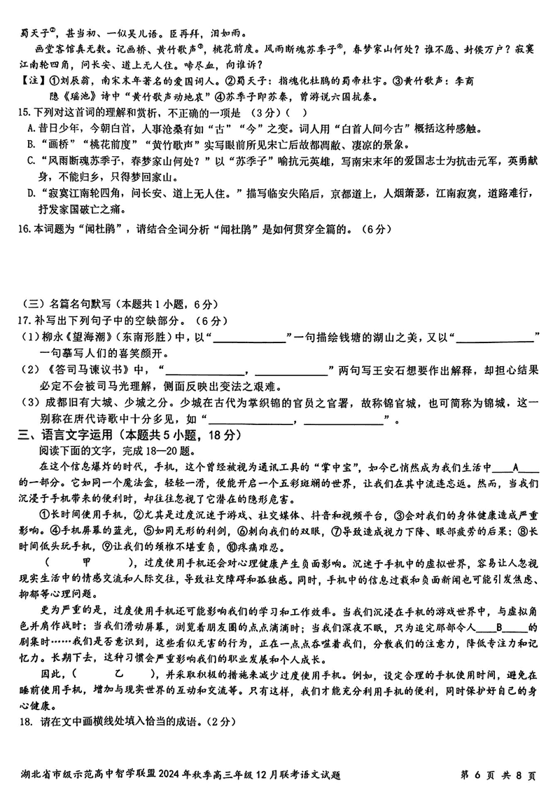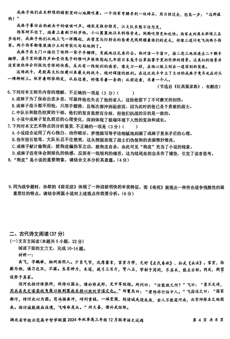 湖北智学联盟2024年秋季高三12月联考语文试题及答案
