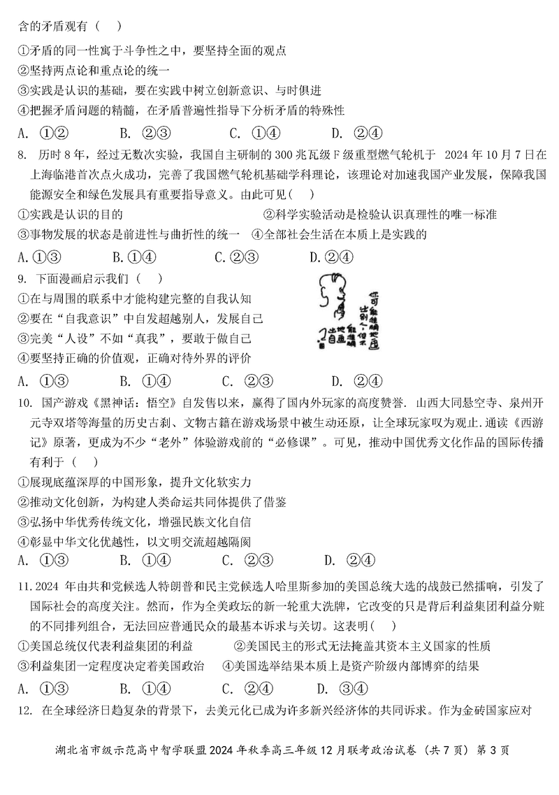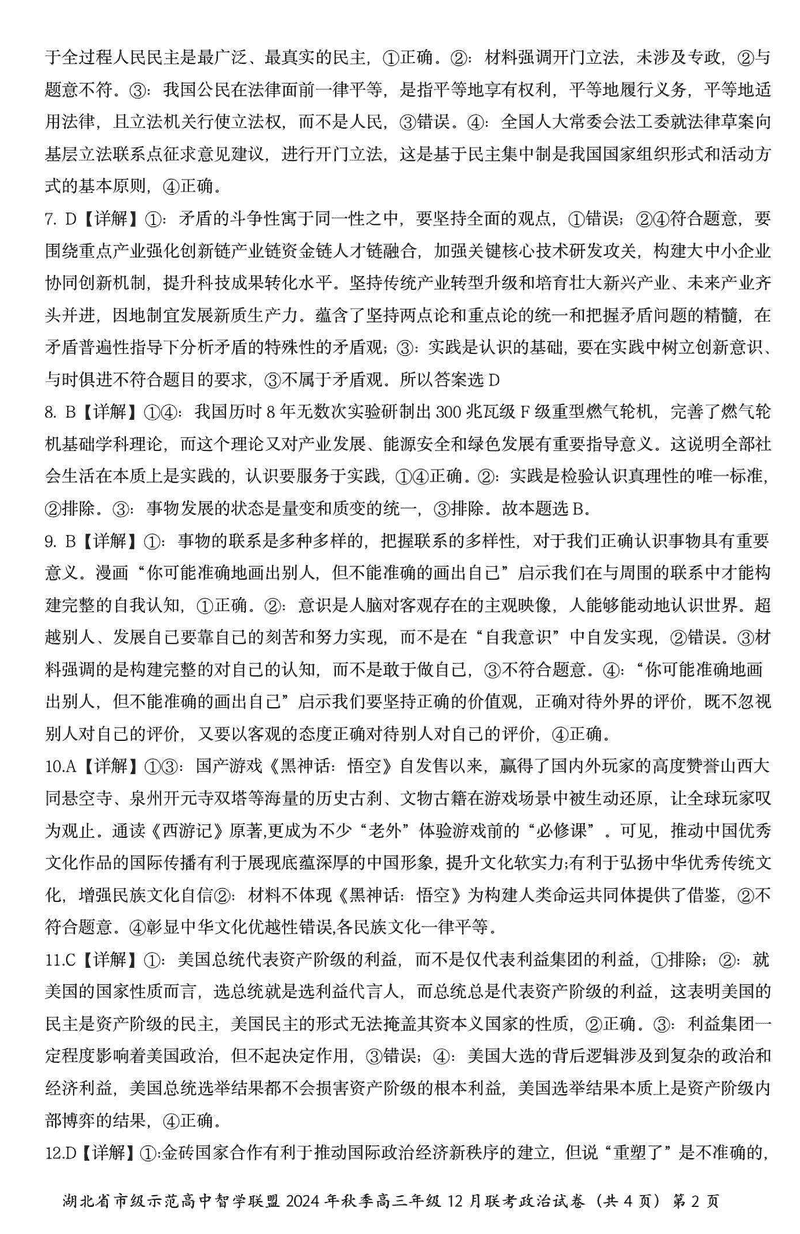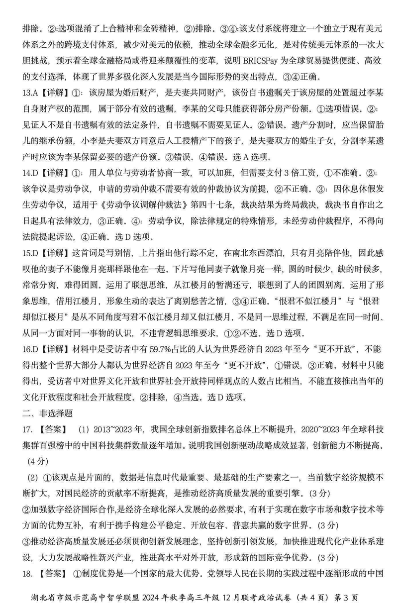 湖北智学联盟2024年秋季高三12月联考政治试题及答案