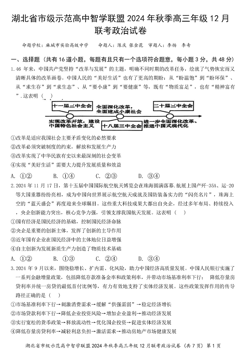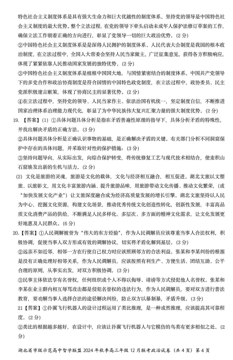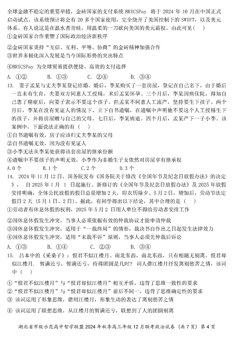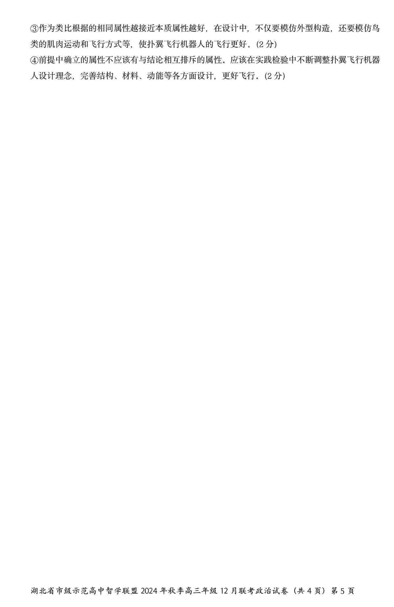 湖北智学联盟2024年秋季高三12月联考政治试题及答案