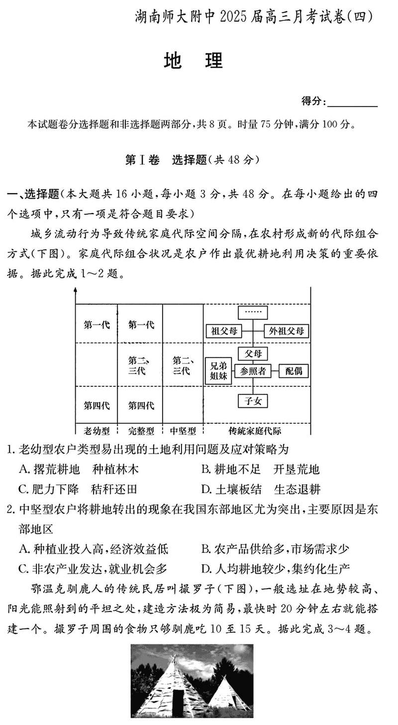 湖南师大附中2025届高三月考试卷(四)地理试题及答案
