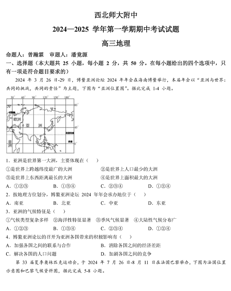 西北师大附中2024-2025学年高三上学期期中地理考试已于近日开考,为方便考生考后及时查看考试情况,查漏补缺、弥补不足,本文整理了试题答案解析相关信息!