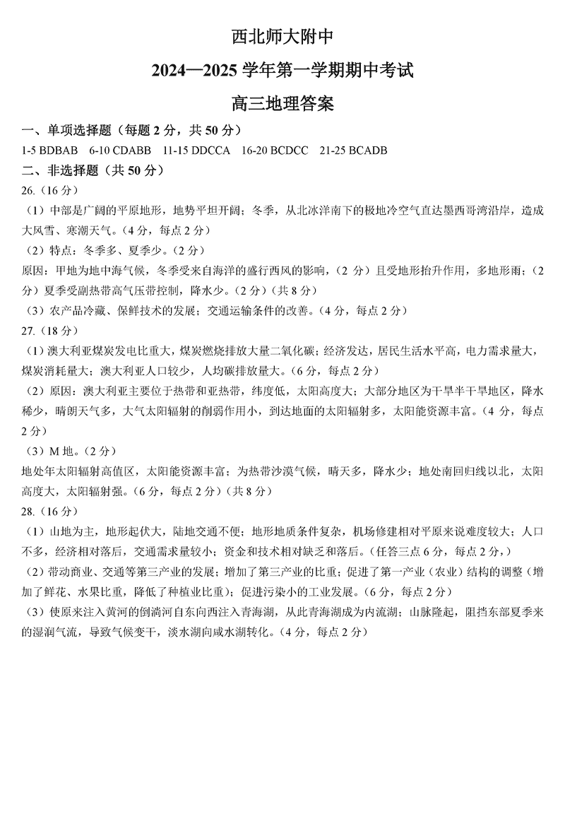 西北师大附中2024-2025学年高三上学期期中地理试题及答案