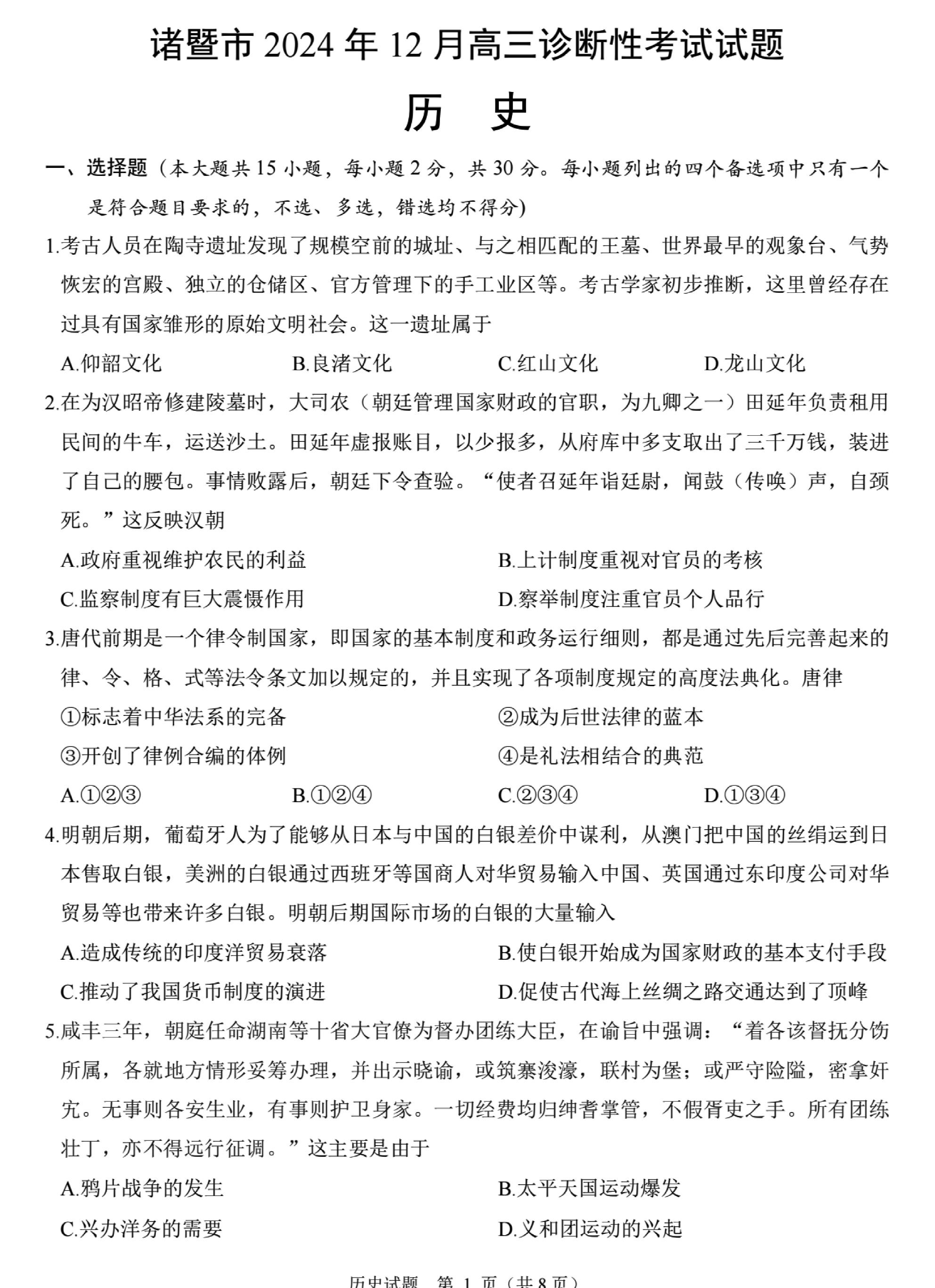 诸暨一模2025届高三上学期12月诊断历史试题及答案