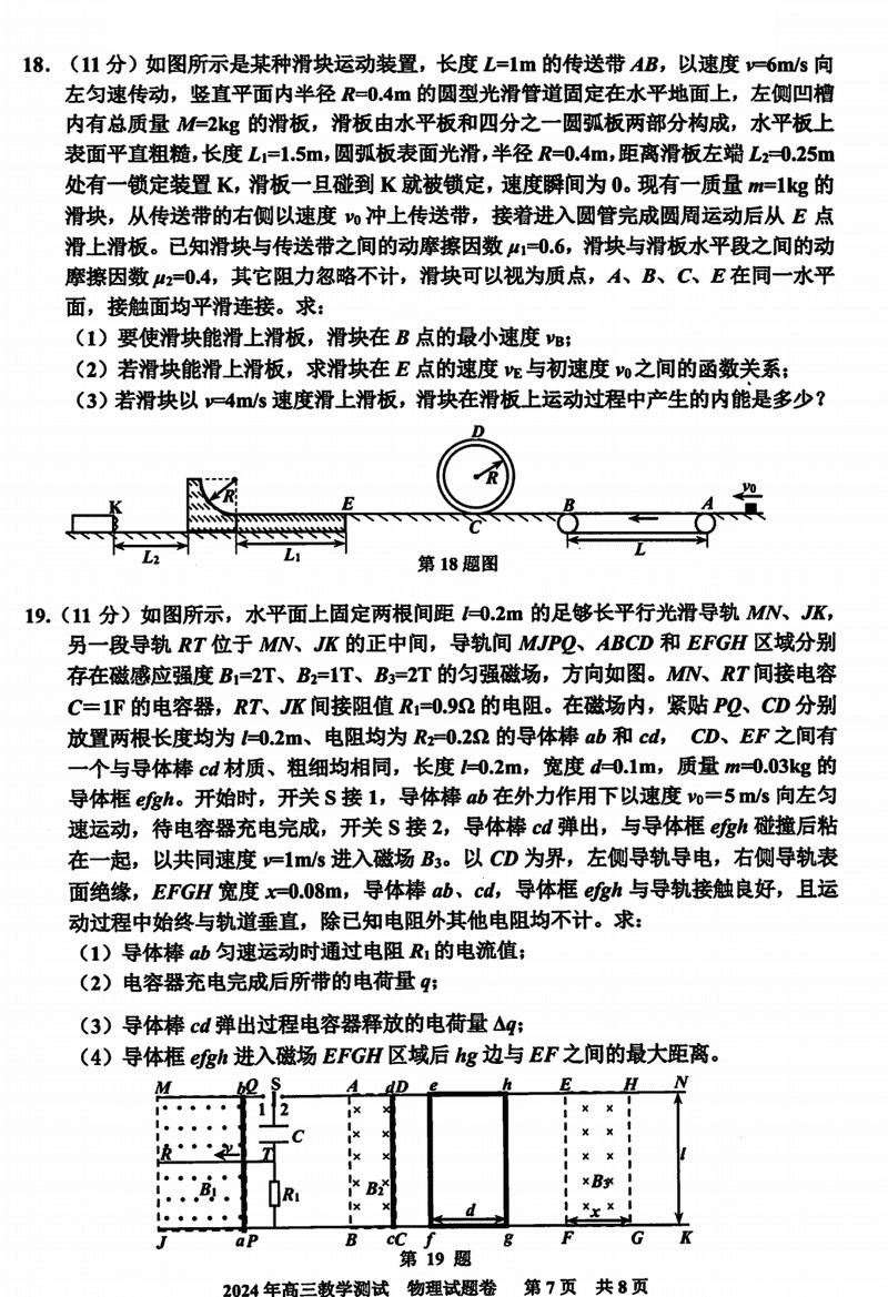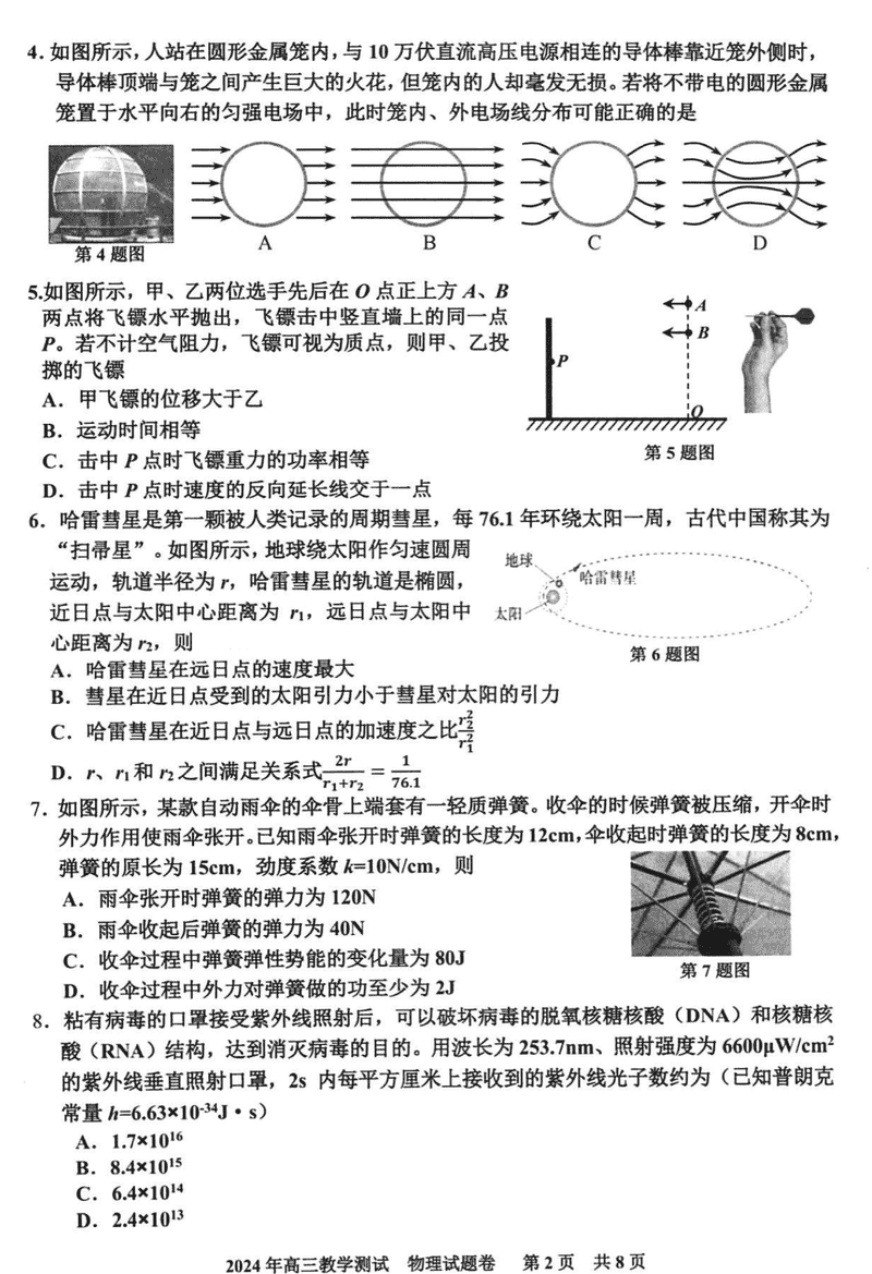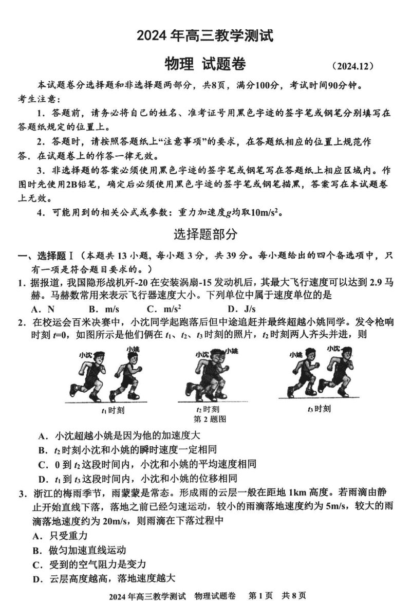 浙江嘉兴一模2024年高三12月教学测试物理试题及答案