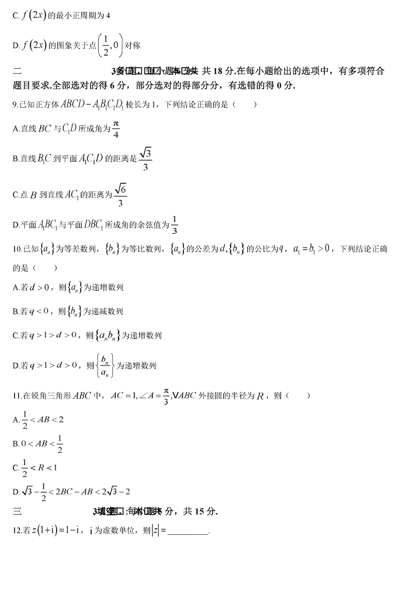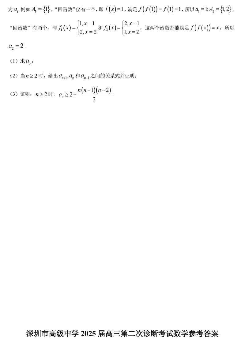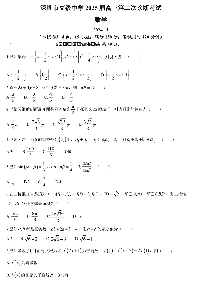 深圳高级中学2024-2025学年高三上第二次诊断数学试题及答案