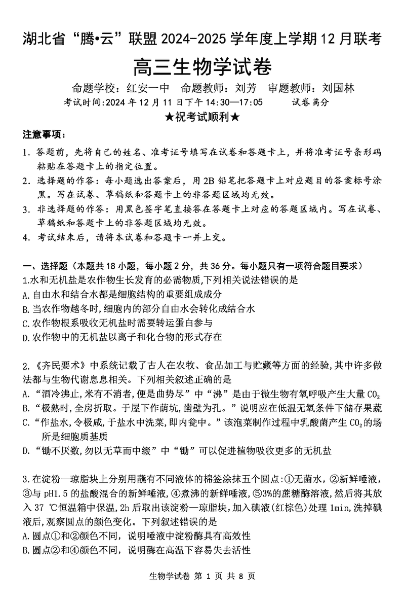 湖北省腾云联盟2025届高三12月联考生物试题及答案 时间:2024-12-12 12:32 湖北 理综试题 湖北省腾云联盟2025届高三12月联考生物考试已于近日开考,为方便考生考后及时查看考试情况,查漏补缺、弥补不足,本文整理了试题答案解析相关信息! 汇总:湖北省腾云联盟2025届高三12月联考试题及答案汇总 生物试题及答案解析
