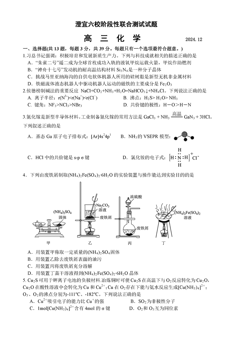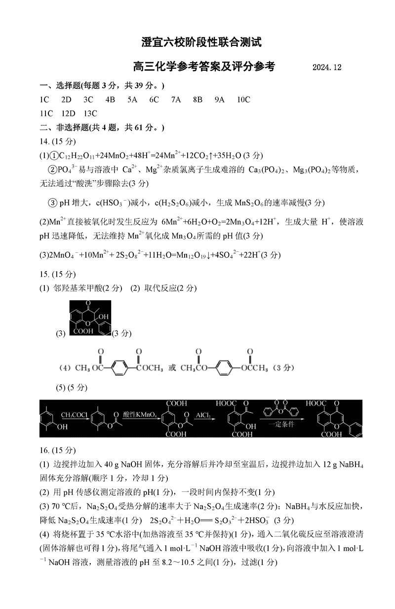 无锡澄宜六校2025届高三上学期12月联考化学试题及答案