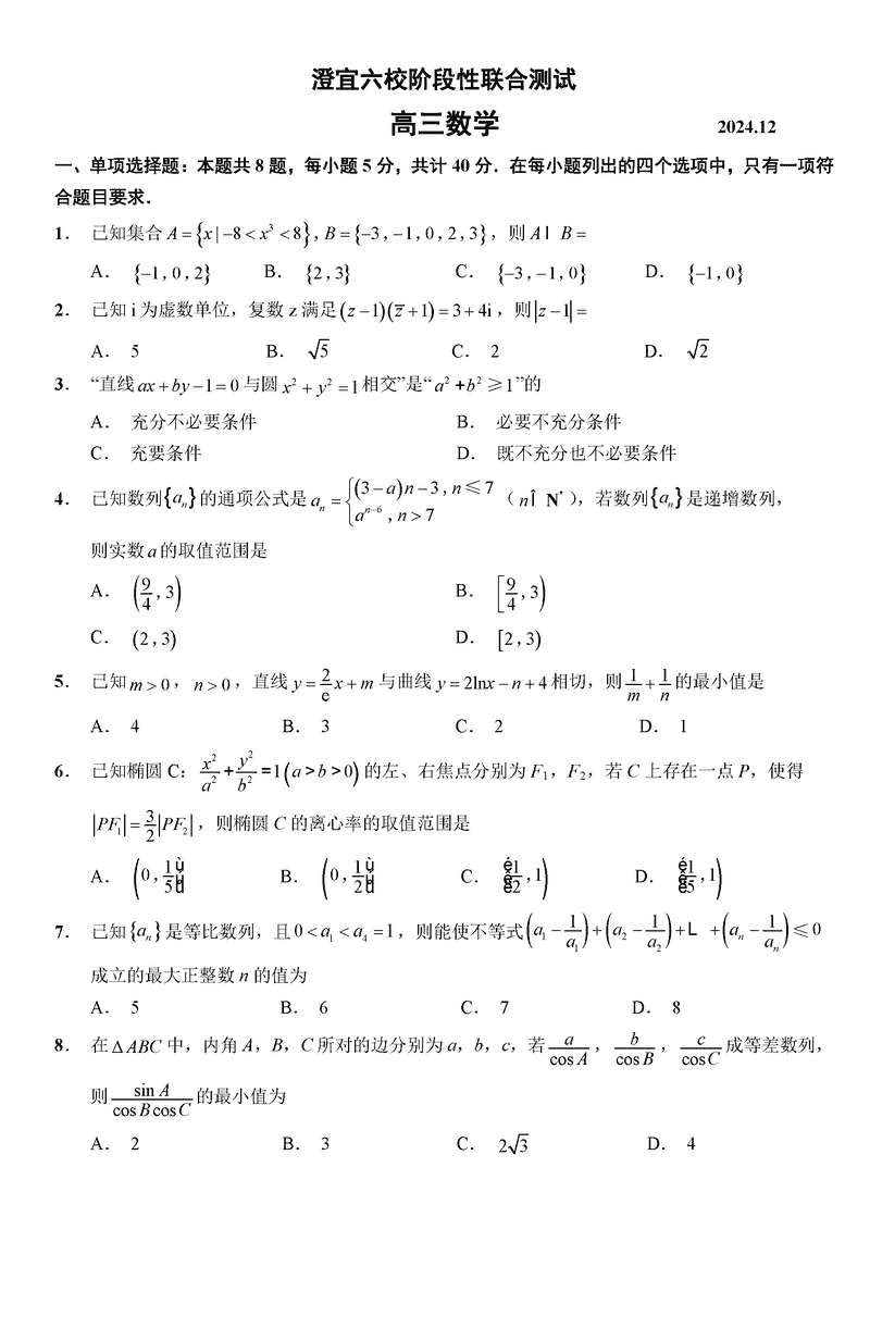 无锡澄宜六校2025届高三上学期12月联考数学试题及答案