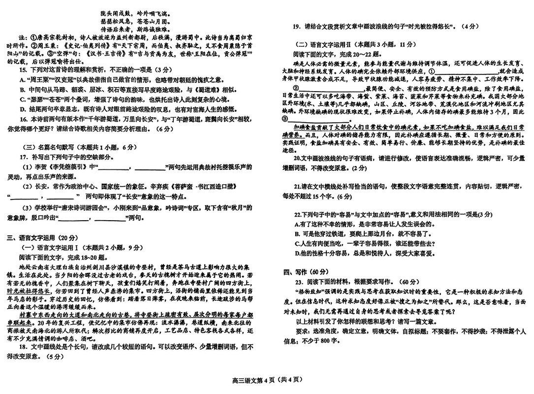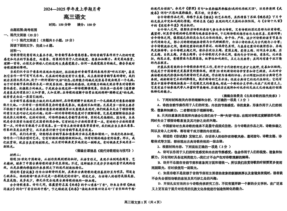 鞍山市普通高中2025届高三上第三次月考语文试题及答案