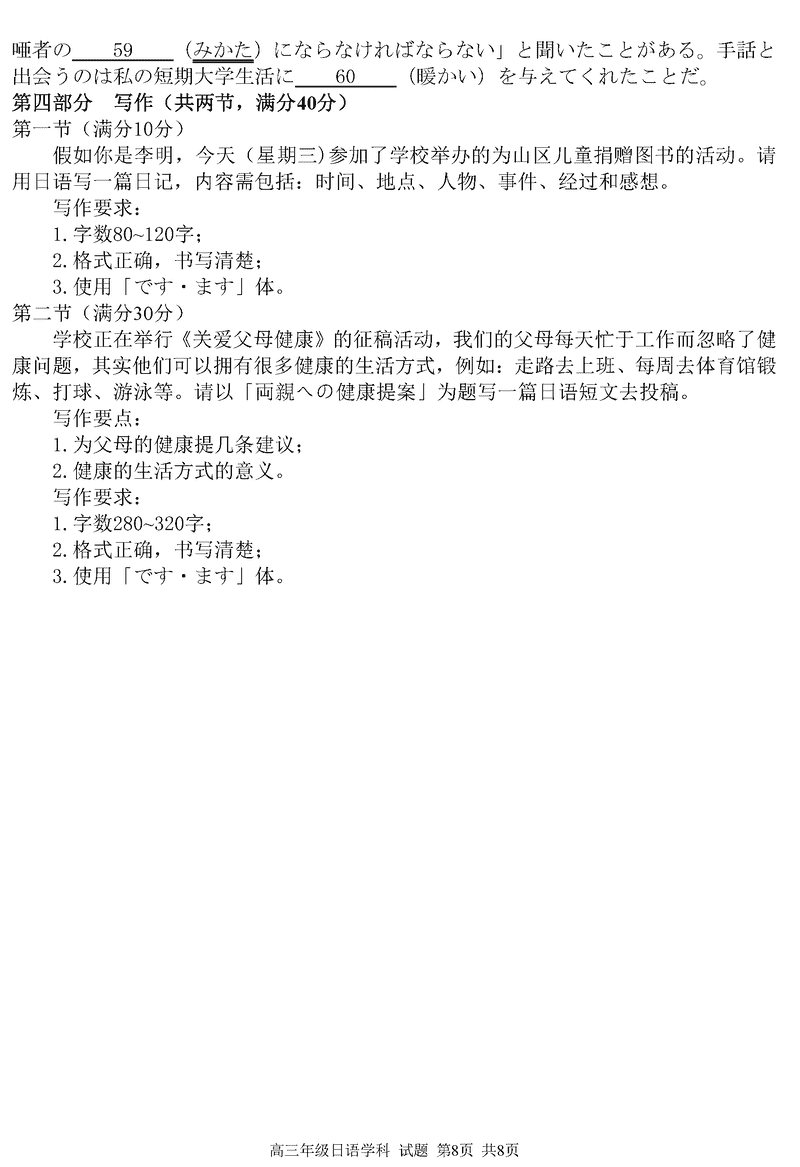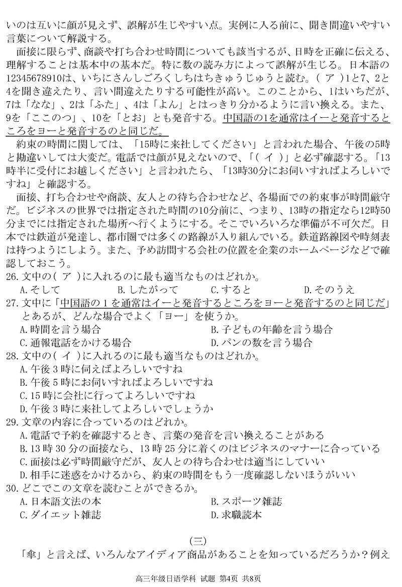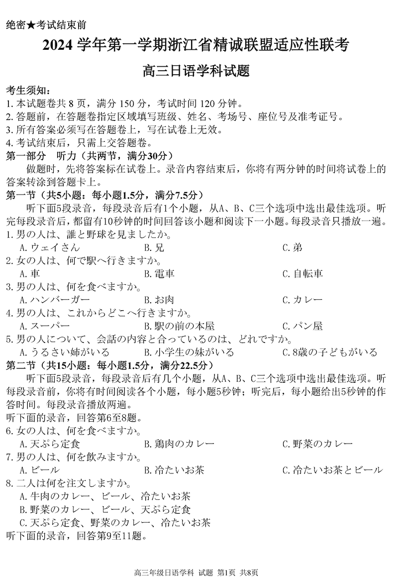 浙江精诚联盟2024学年12月高三上联考日语试题及答案