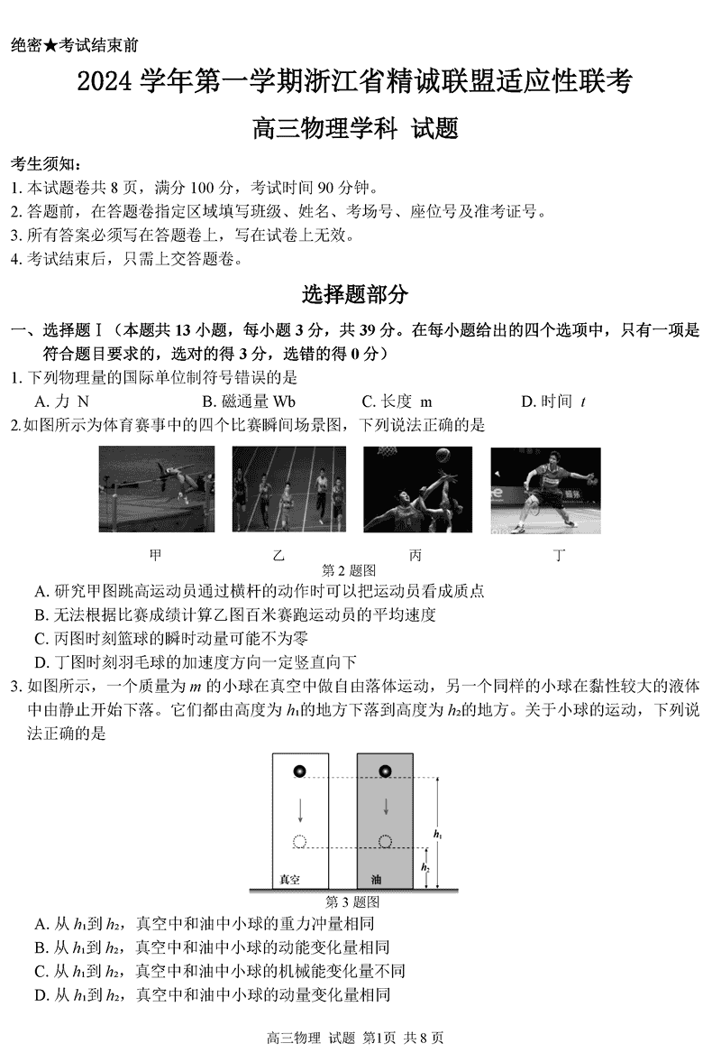 浙江省精诚联盟2024学年12月高三上学期适应性联考物理考试已于近日开考,为方便考生考后及时查看考试情况,查漏补缺、弥补不足,本文整理了试题答案解析相关信息!