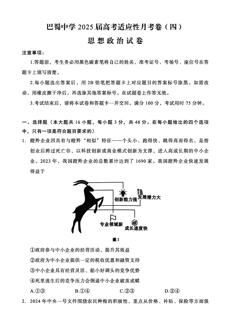重庆巴蜀中学2025届高三12月适应性月考(四)政治考试已于近日开考,为方便考生考后及时查看考试情况,查漏补缺、弥补不足,本文整理了试题答案解析相关信息!