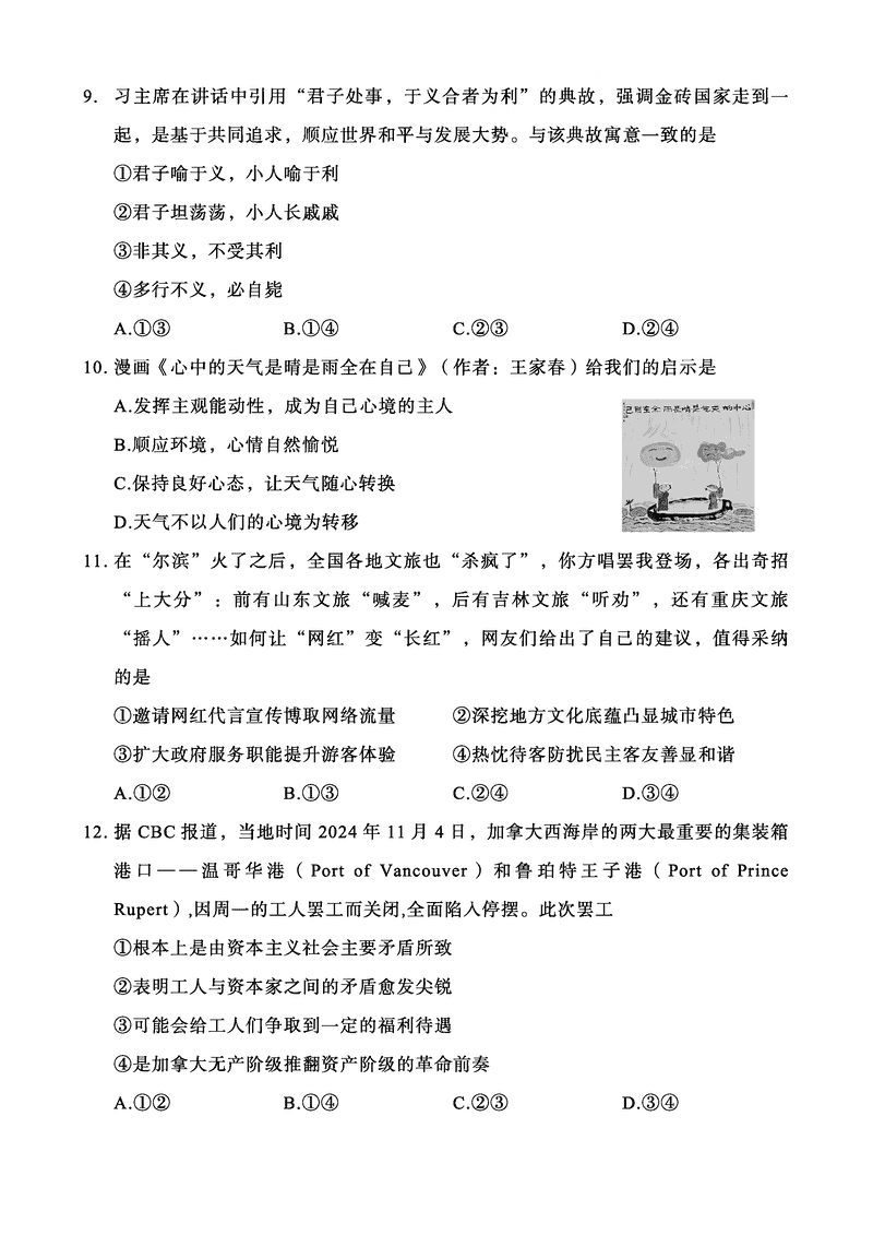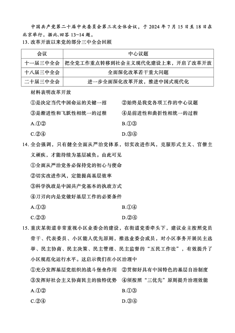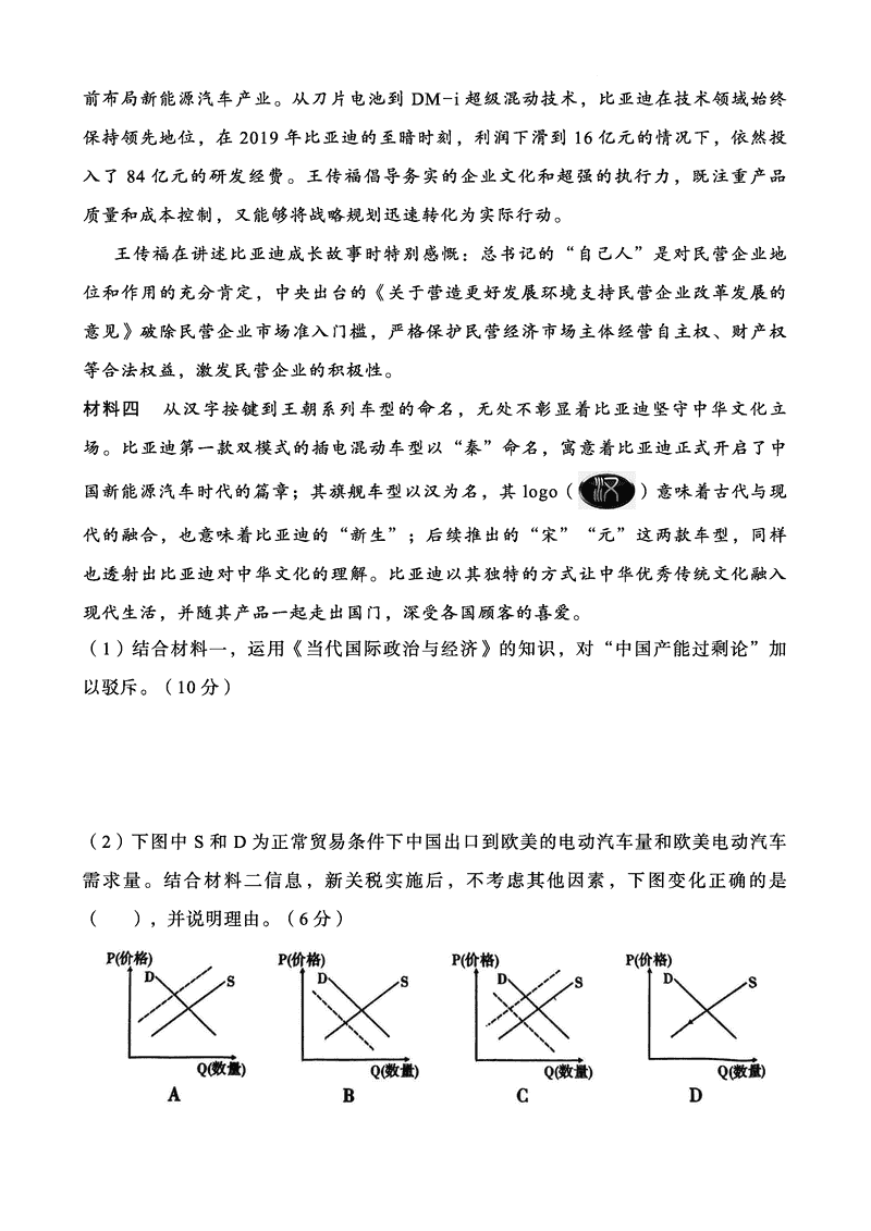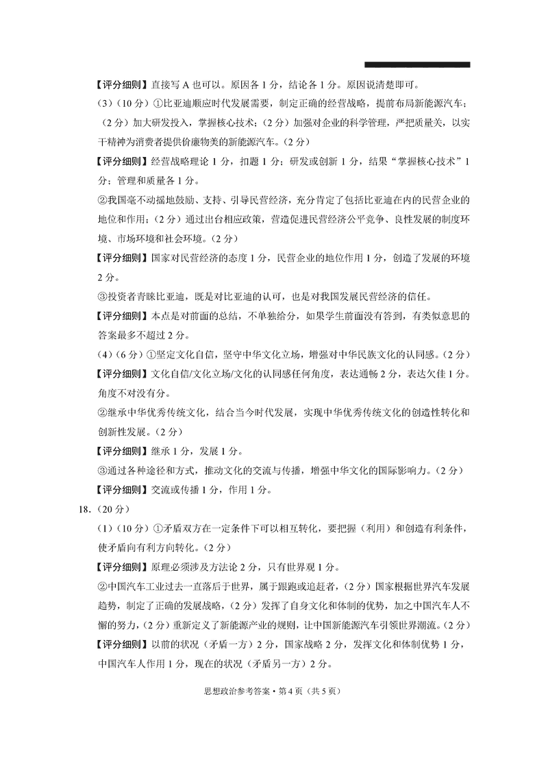 重庆巴蜀中学2025届高三12月适应性月考(四)政治试题及答案