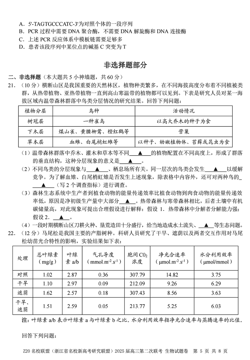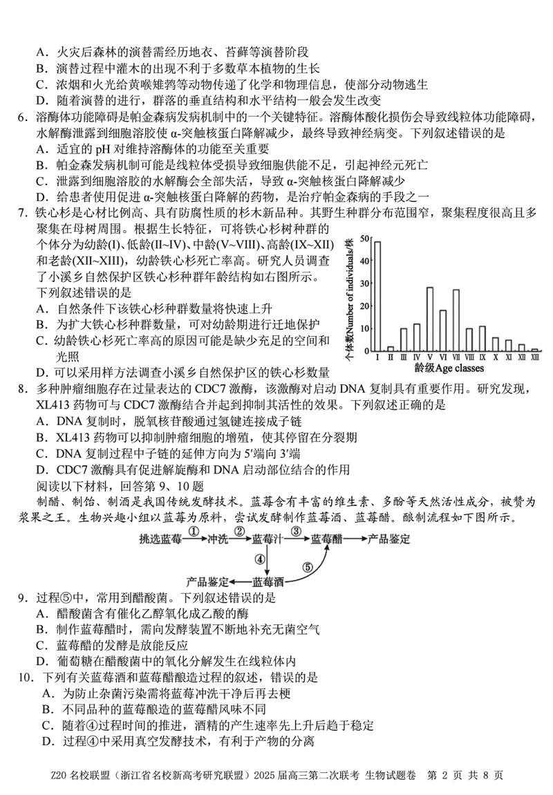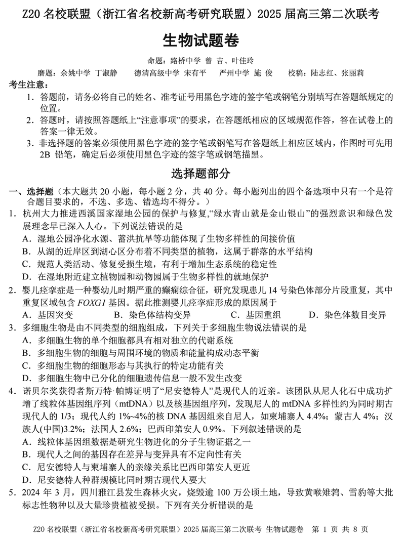浙江Z20名校联盟2025届高三上学期第二次联考生物试题及答案