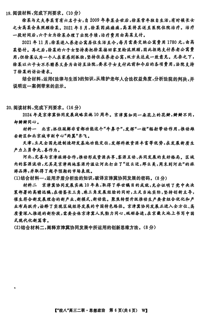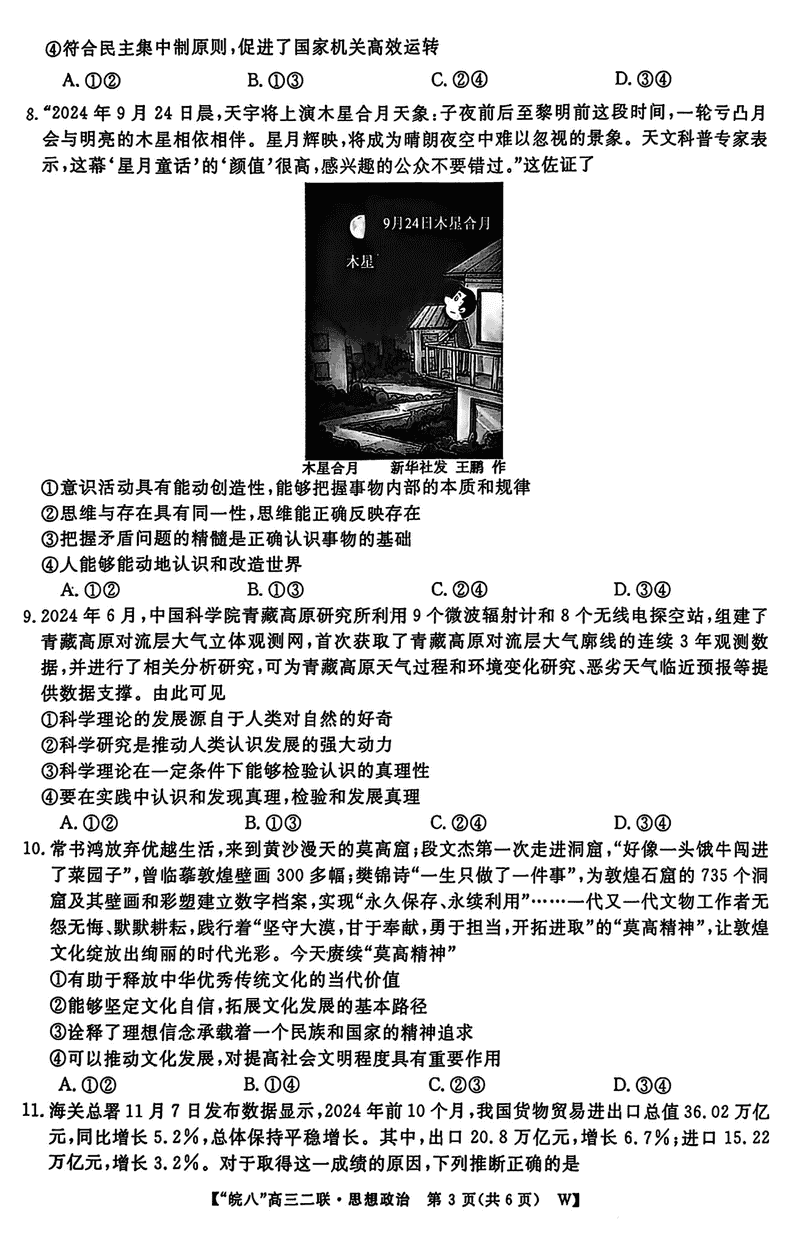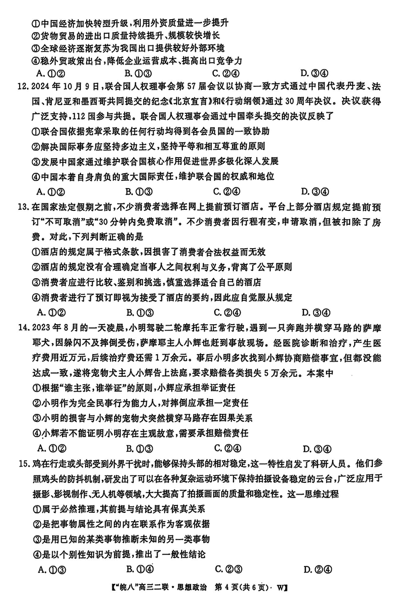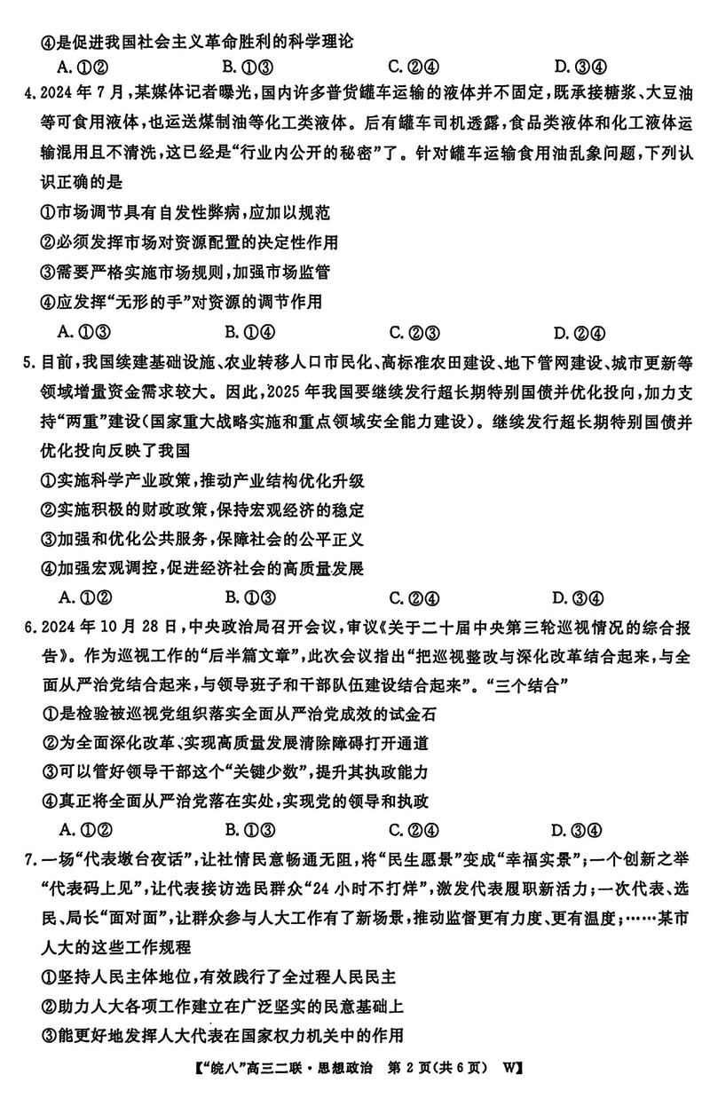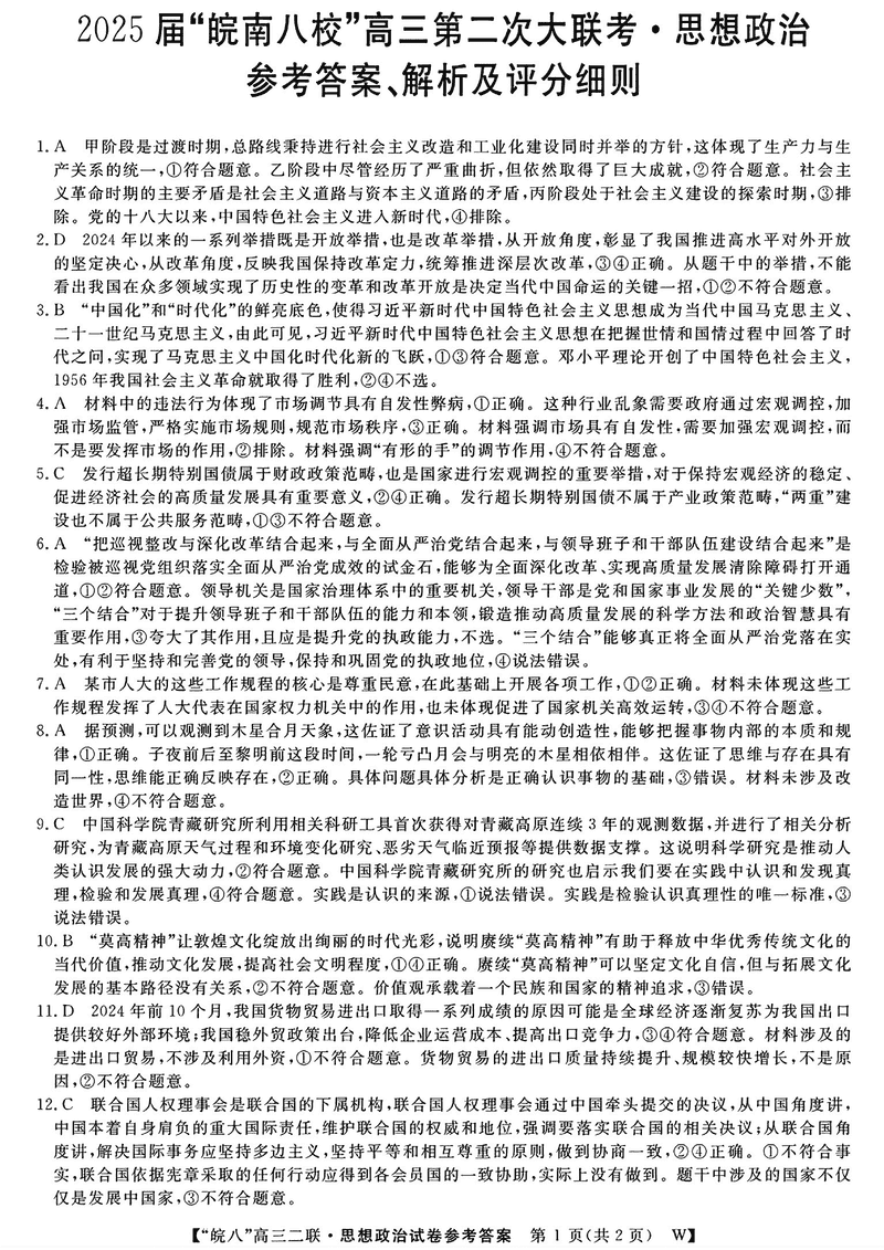 皖南八校2025届高三上学期第二次大联考政治试题及答案
