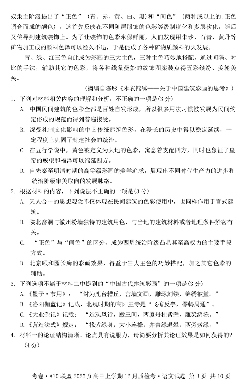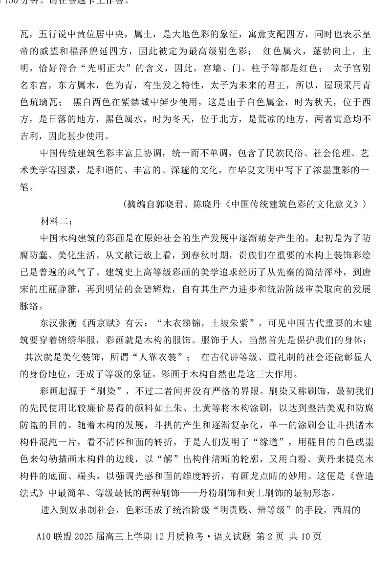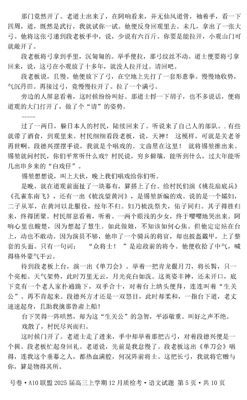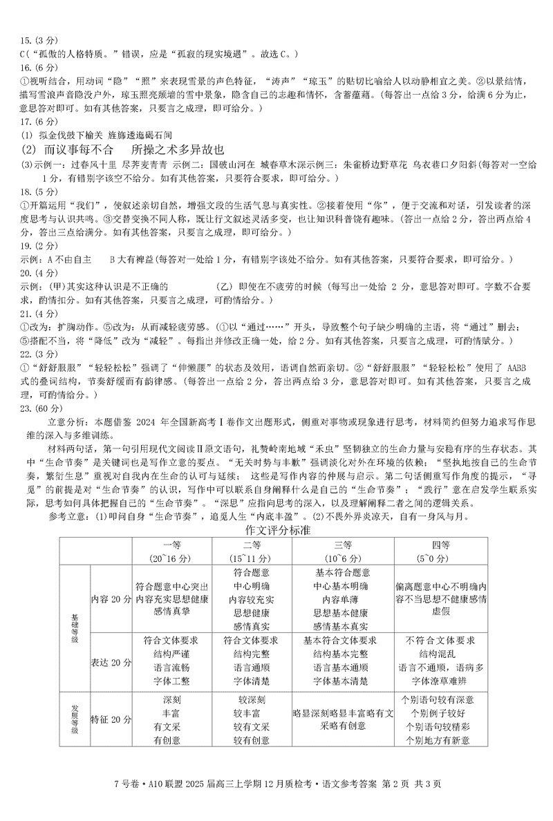 安徽省1号卷A10联盟2025届高三上学期12月质检语文试题及答案