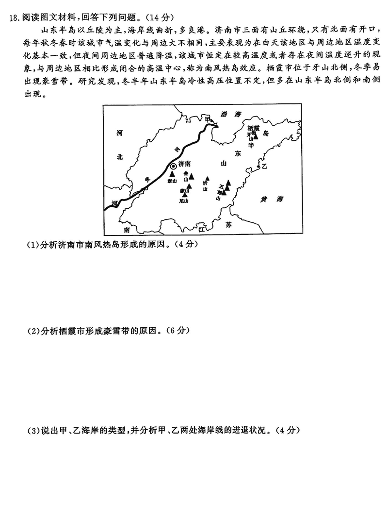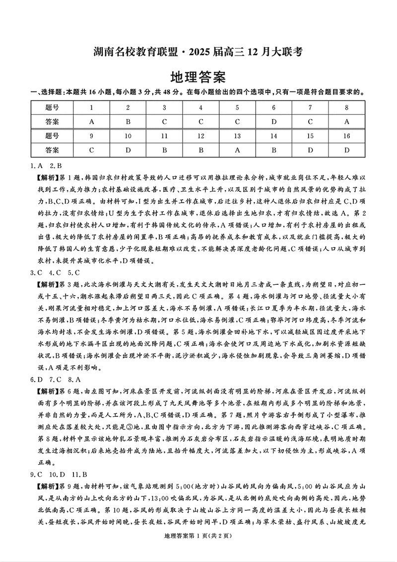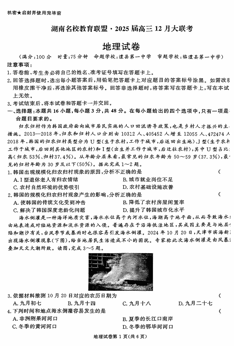 湖南省名校教育联盟·2025届高三12月大联考地理试题及答案