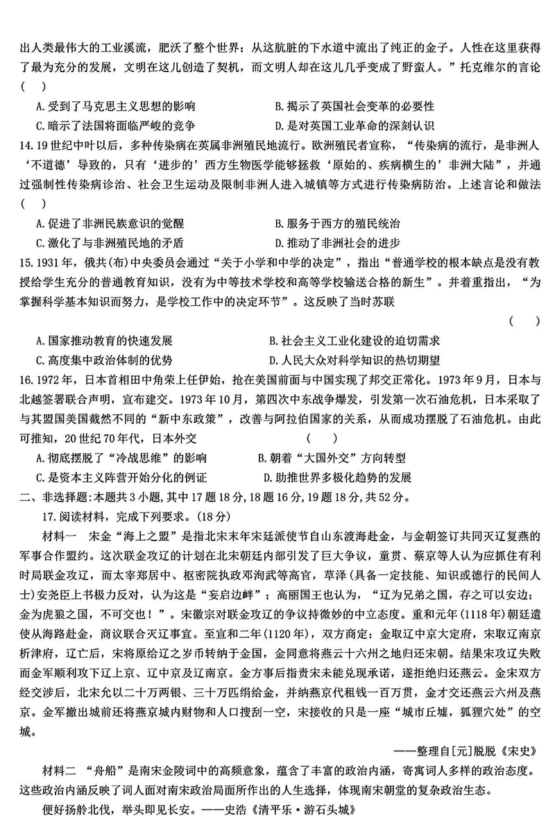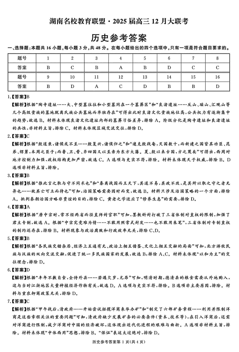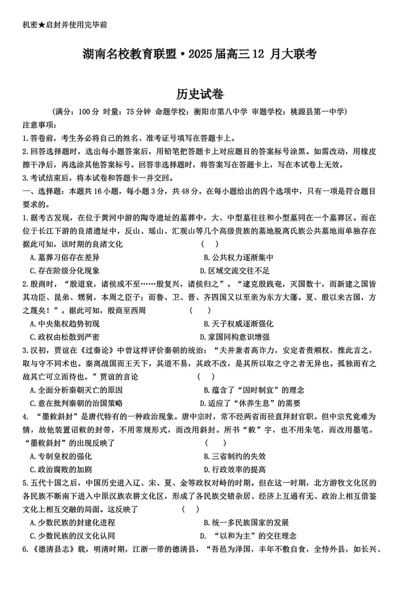 湖南省名校教育联盟·2025届高三12月大联考历史试题及答案