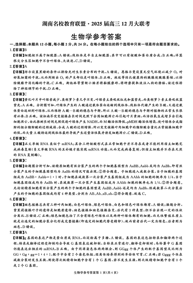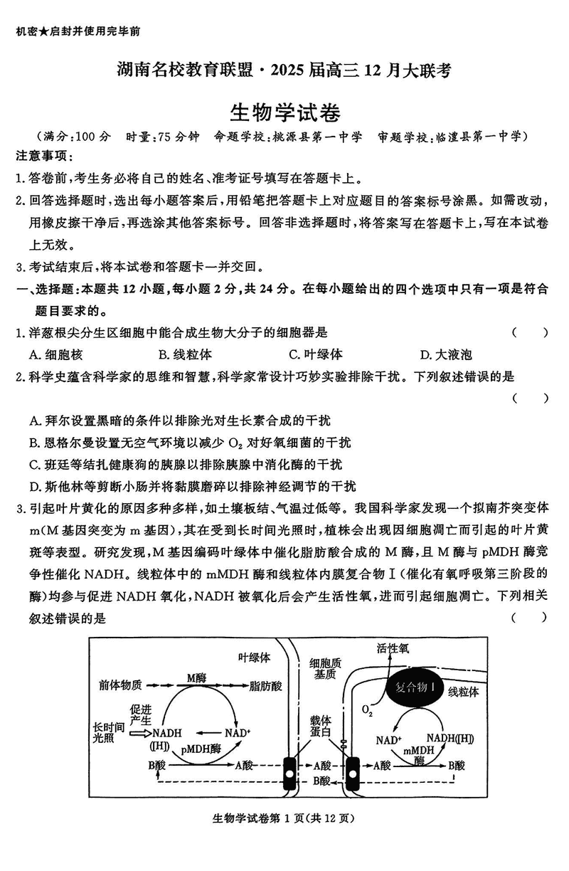湖南省名校教育联盟·2025届高三12月大联考生物试题及答案