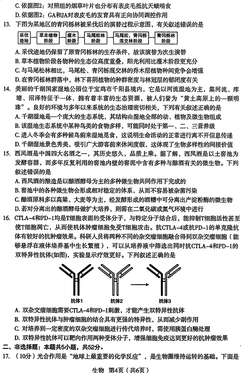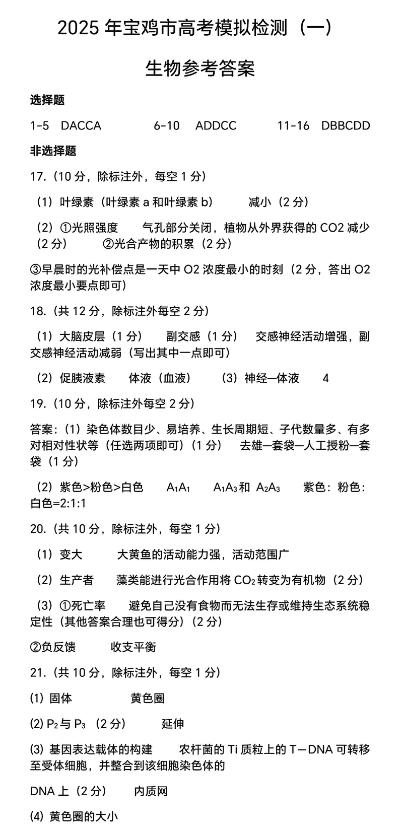 陕西宝鸡2025届高三上学期一模生物试题及答案 时间:2024-12-24 陕西 理综试题 陕西宝鸡2025届高三上学期一模生物考试已于近日开考,为方便考生考后及时查看考试情况,查漏补缺、弥补不足,本文整理了试题答案解析相关信息! 汇总:陕西宝鸡2025届高三上学期一模试题及答案汇总 生物试题及答案解析