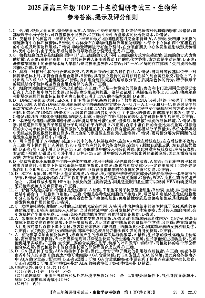 河南省TOP二十名校2025届高三上学期调研(三)生物考试已于近日开考,为方便考生考后及时查看考试情况,查漏补缺、弥补不足,本文整理了试题答案解析相关信息!