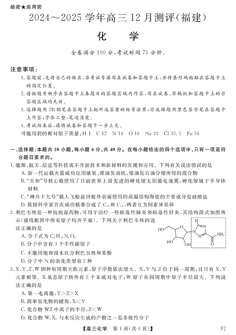 福建省金科大联考2024-2025学年高三12月测评化学试题及答案