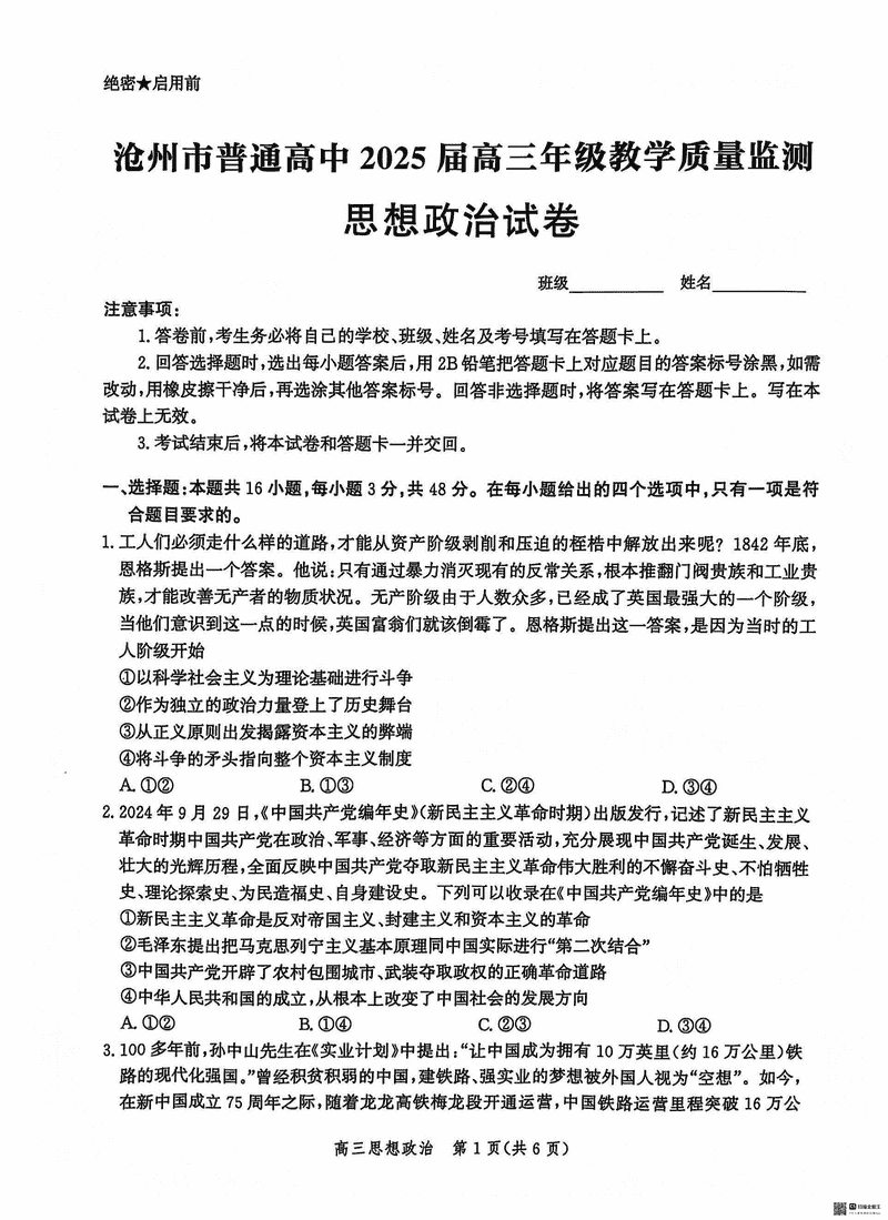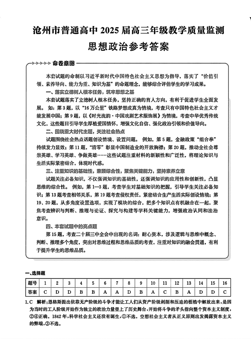 沧州市普通高中2025届高三12月教学质量监测政治考试已于近日开考,为方便考生考后及时查看考试情况,查漏补缺、弥补不足,本文整理了试题答案解析相关信息!