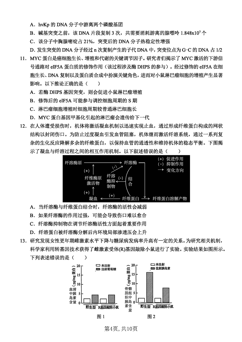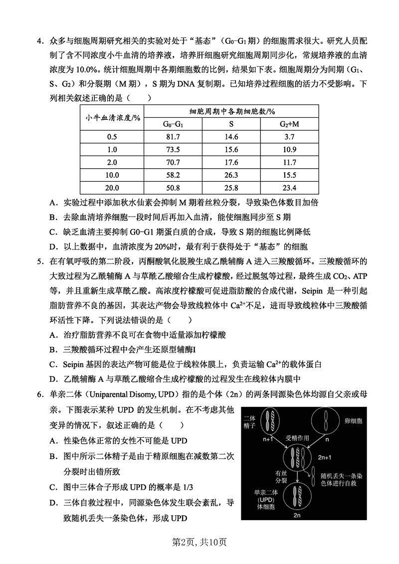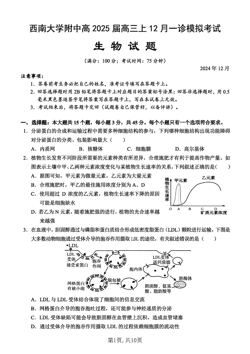 重庆西南大学附中2025届高三12月一诊模拟生物试题及答案