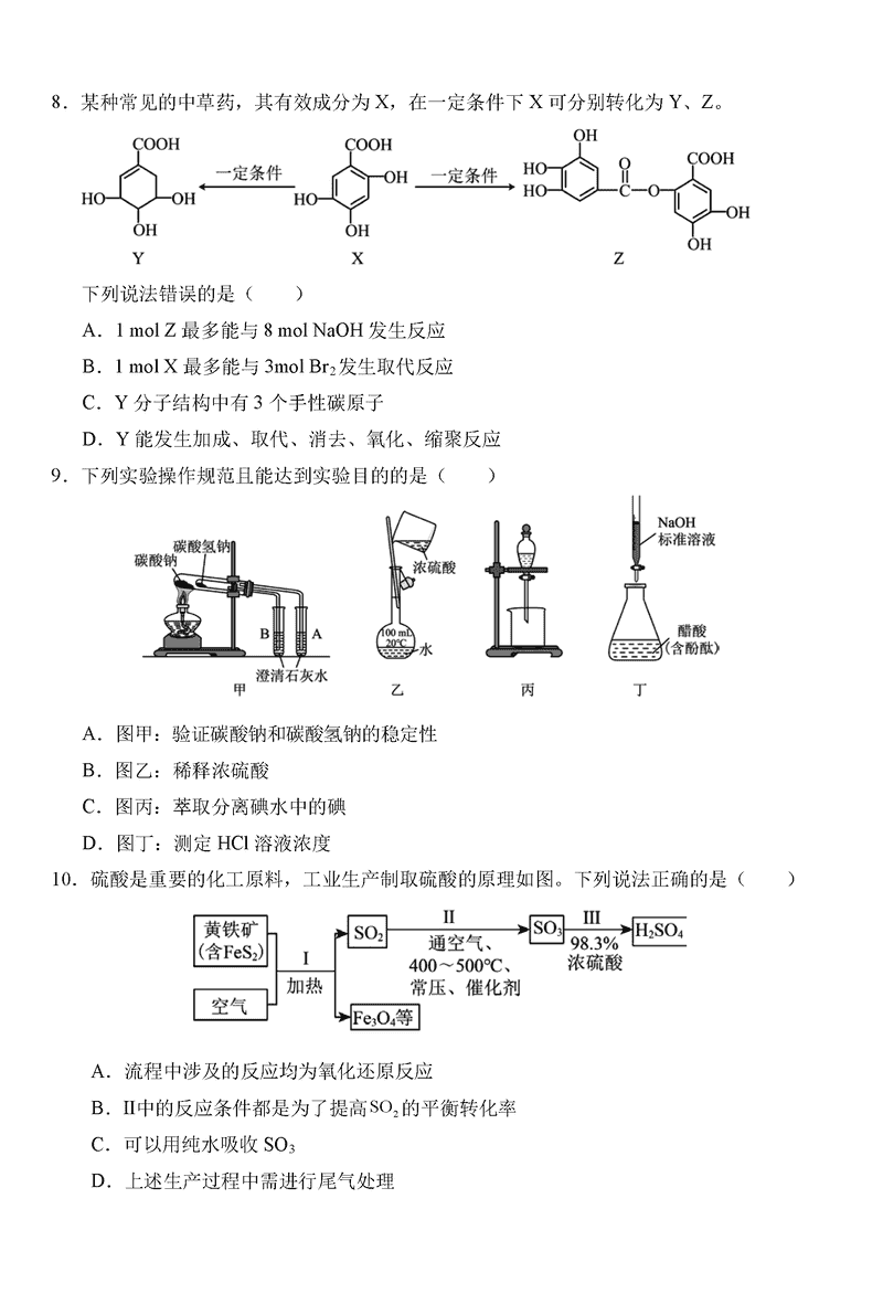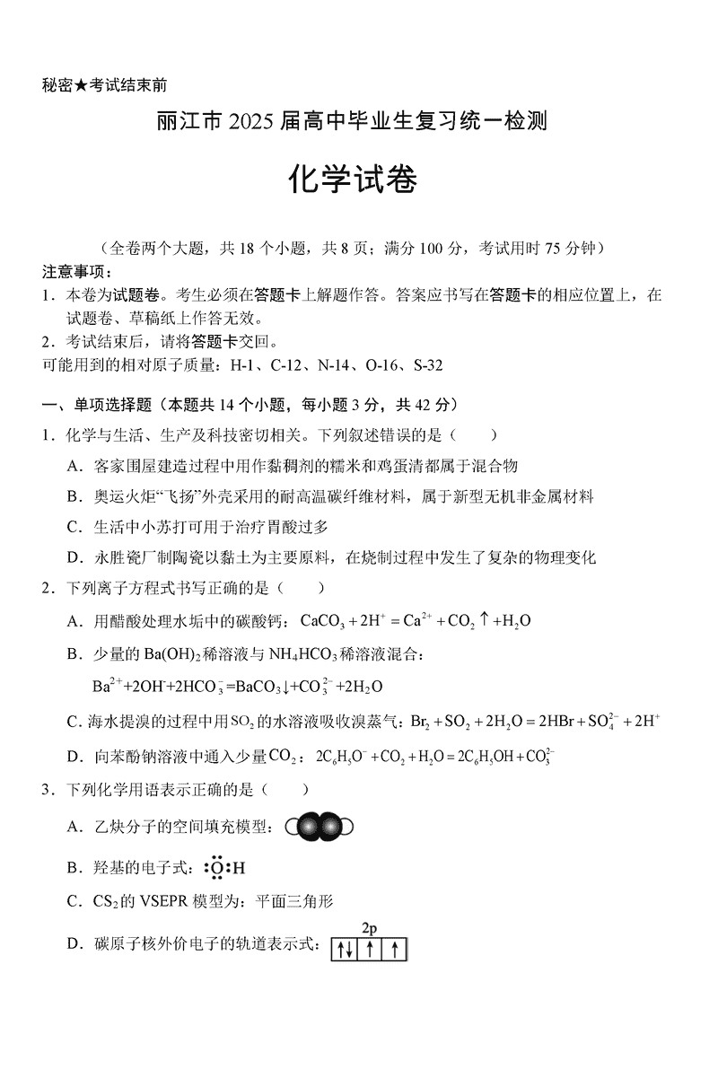 云南丽江2025届高中毕业生复习统一检测化学试题及答案