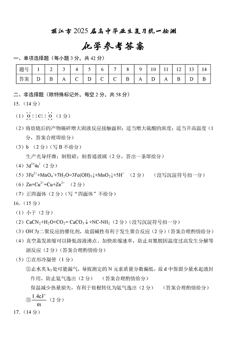 云南丽江2025届高中毕业生复习统一检测化学考试已于近日开考,为方便考生考后及时查看考试情况,查漏补缺、弥补不足,本文整理了试题答案解析相关信息!