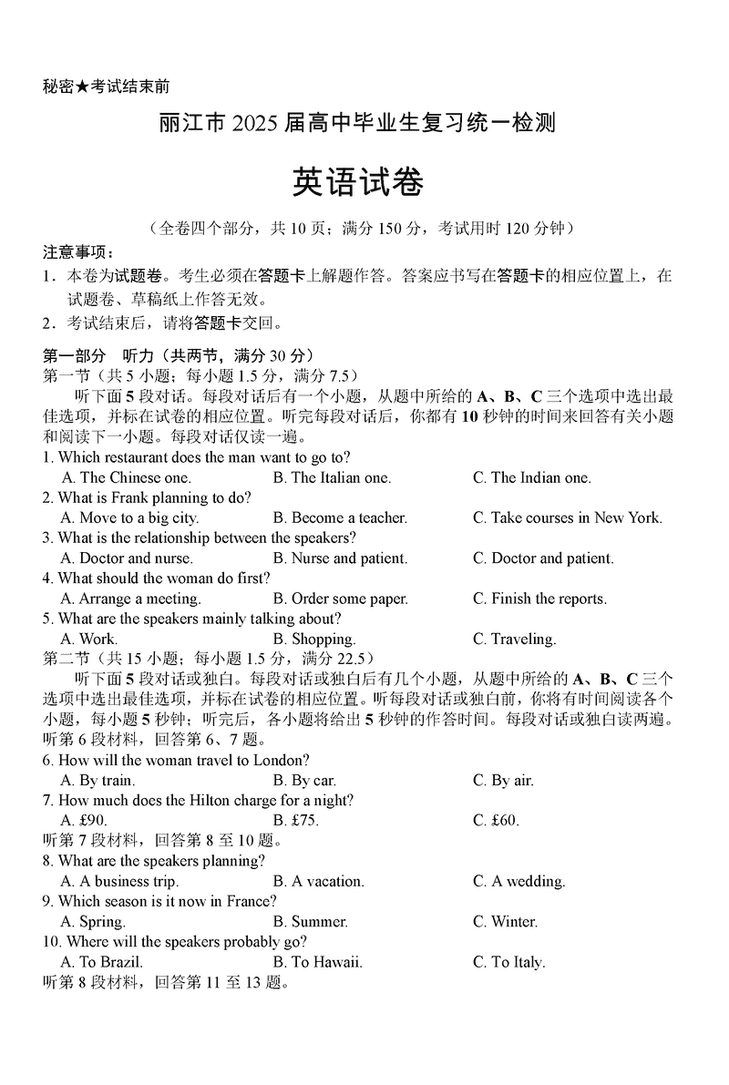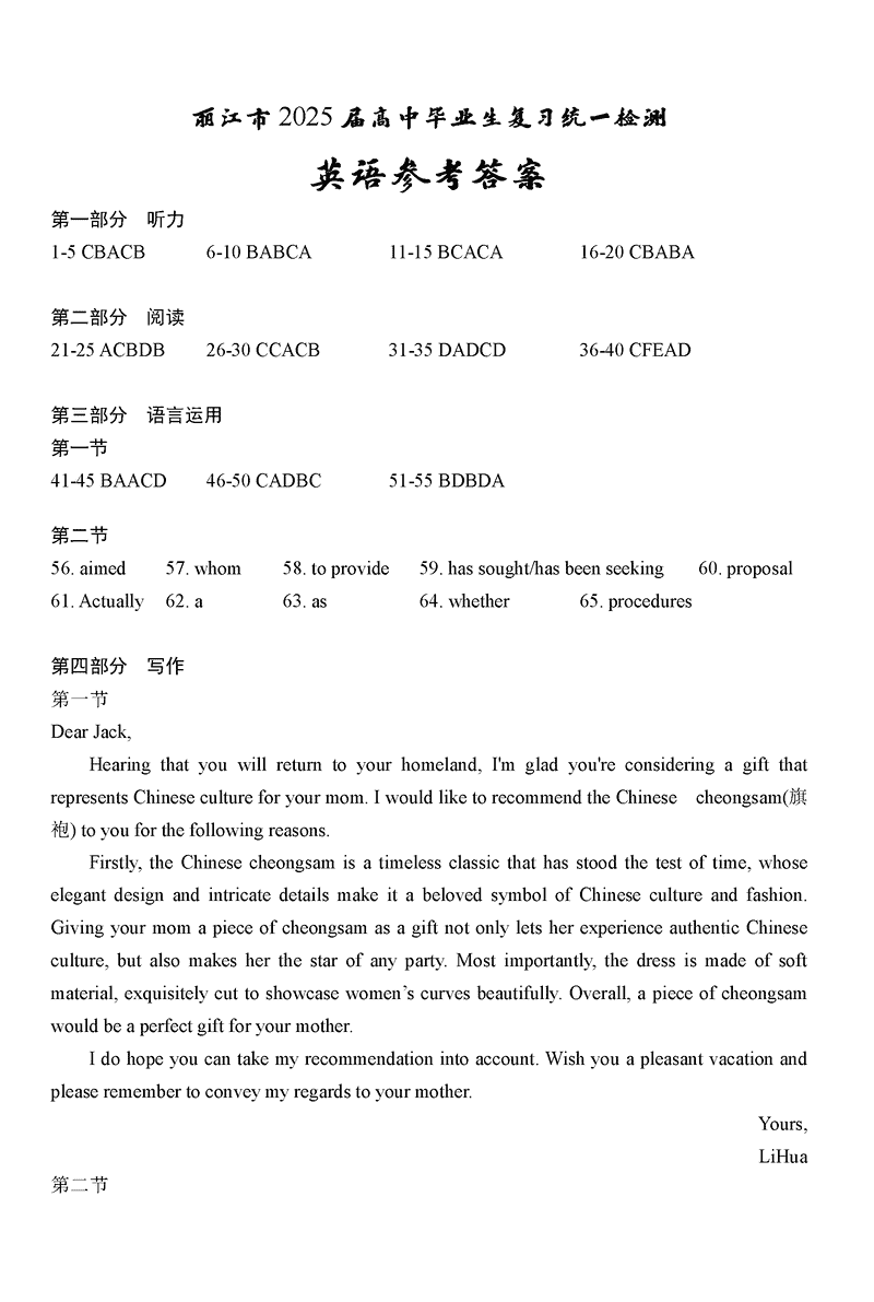 云南丽江2025届高中毕业生复习统一检测英语试题及答案