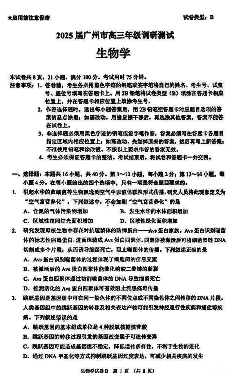 2025届广州零模高三12月调研测试生物试题及答案 时间:2024-12-26 广东 理综试题 2025届广州零模高三12月调研测试生物考试已于近日开考,为方便考生考后及时查看考试情况,查漏补缺、弥补不足,本文整理了试题答案解析相关信息! 汇总:2025届广州零模高三12月调研测试试题及答案汇总 生物试题及答案解析