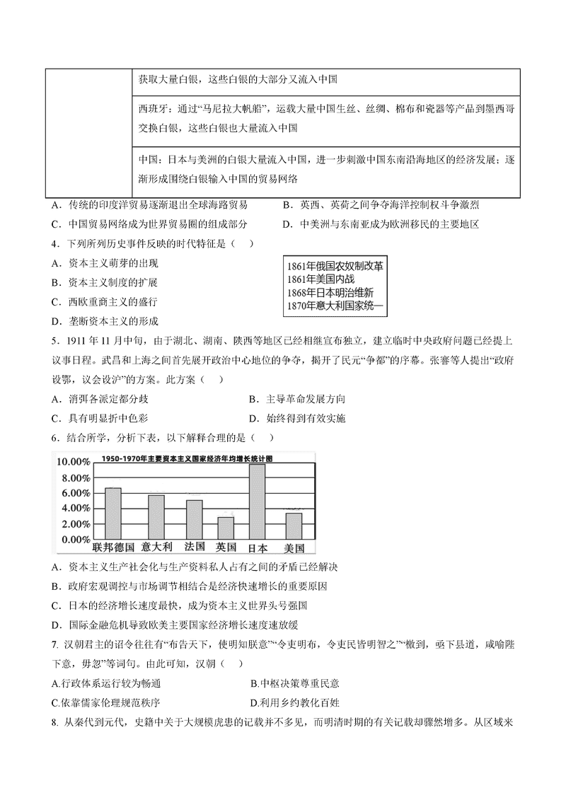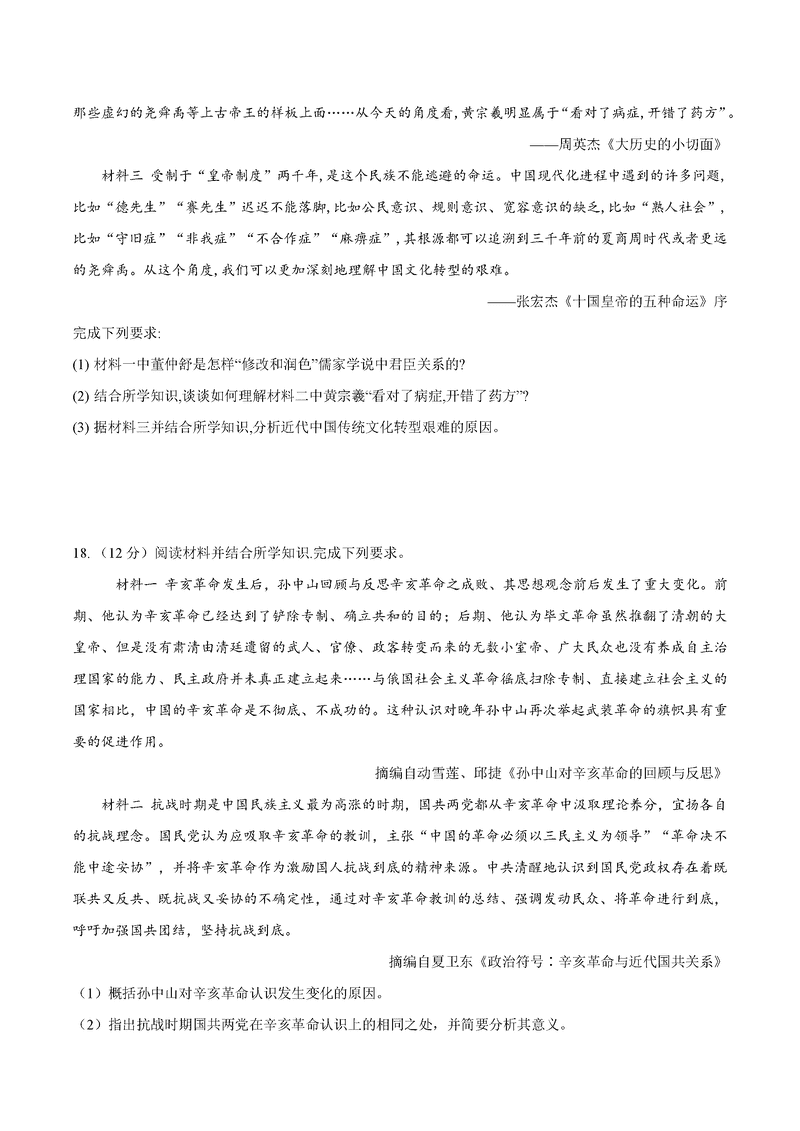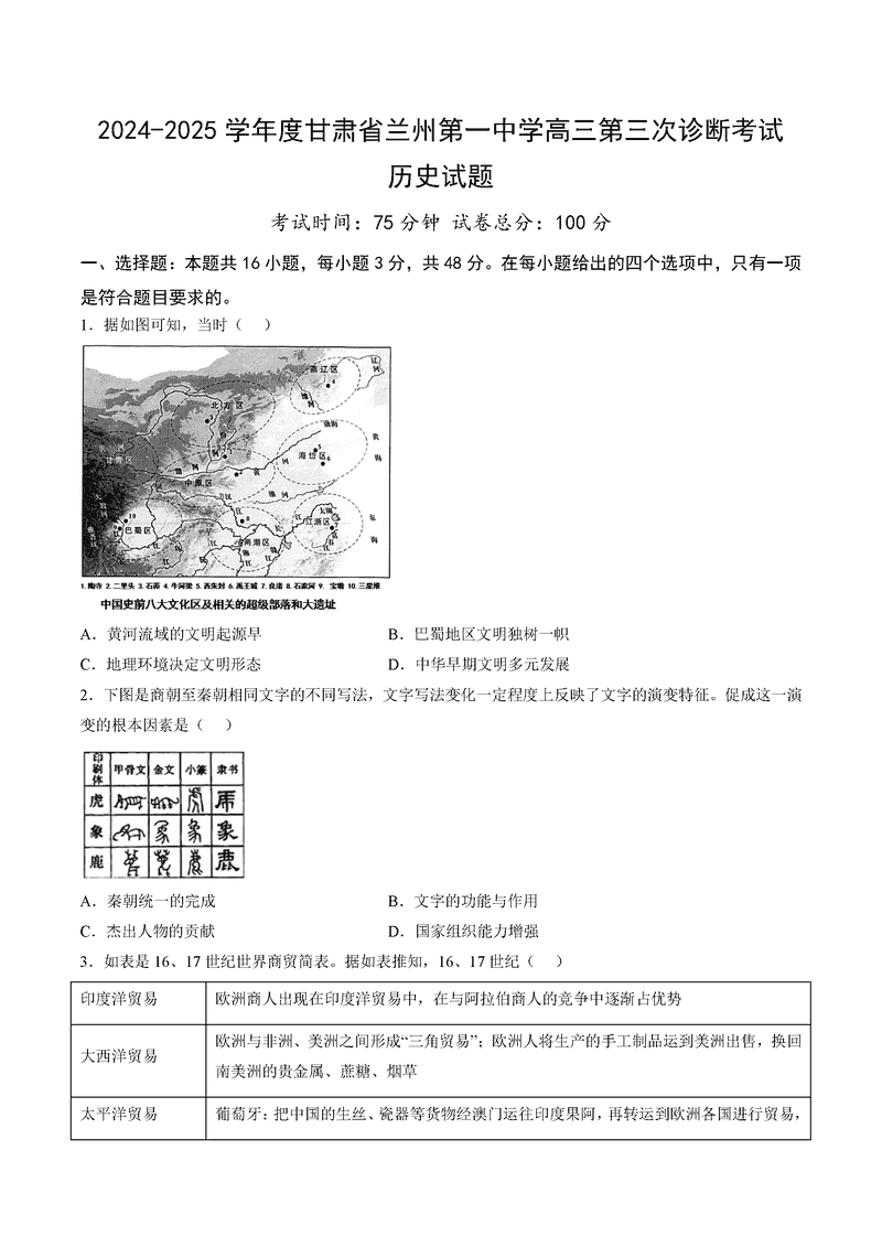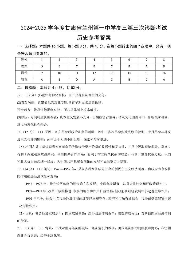 兰州一中2024-2025学年高三上第三次诊断历史试题及答案