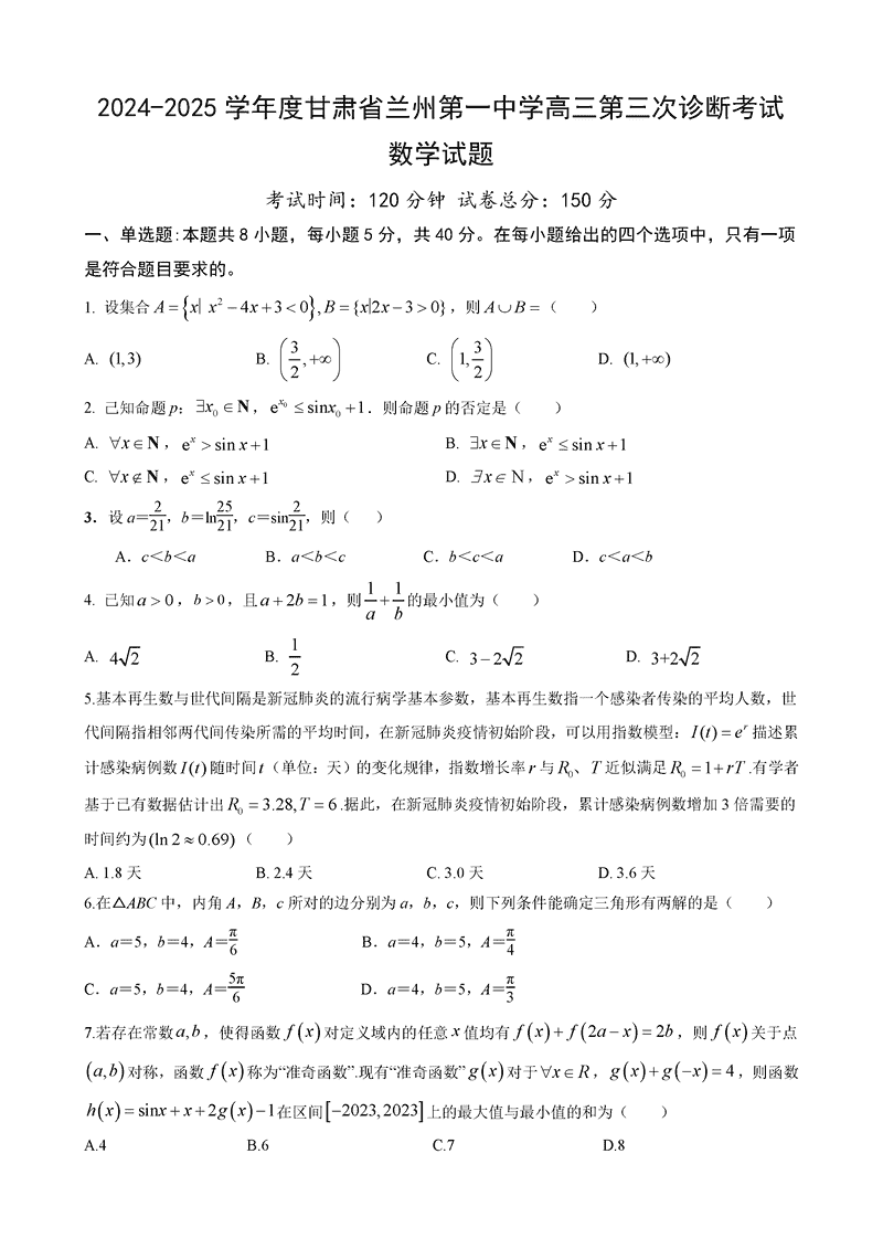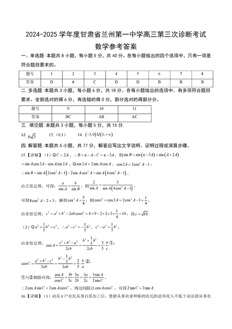 兰州一中2024-2025学年高三上第三次诊断数学考试已于近日开考,为方便考生考后及时查看考试情况,查漏补缺、弥补不足,本文整理了试题答案解析相关信息!