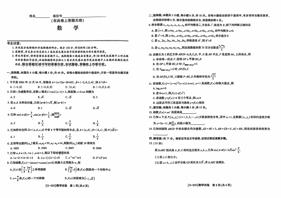 安徽皖江名校2024年高三上学期12月月考数学试题及答案