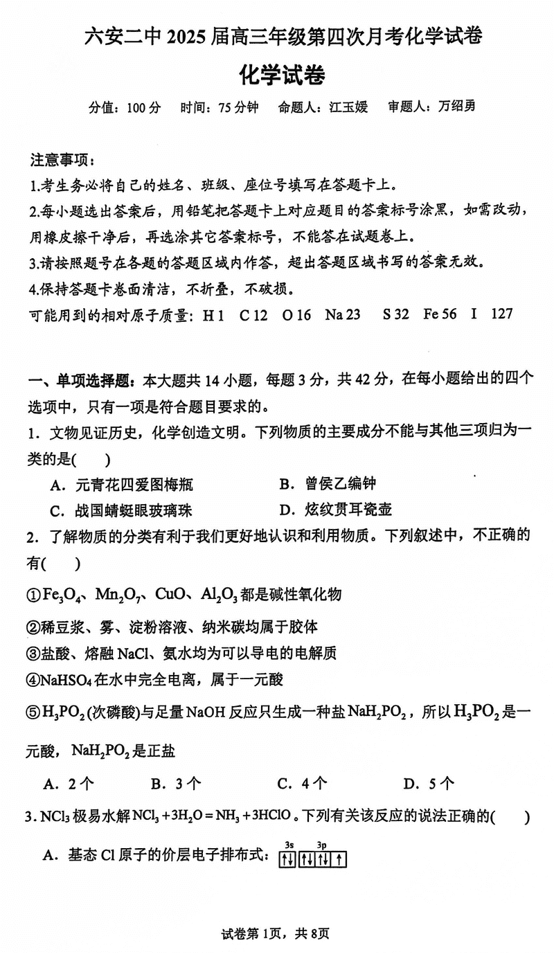 安徽六安二中2025届高三上学期12月第四次月考化学考试已于近日开考,为方便考生考后及时查看考试情况,查漏补缺、弥补不足,本文整理了试题答案解析相关信息!