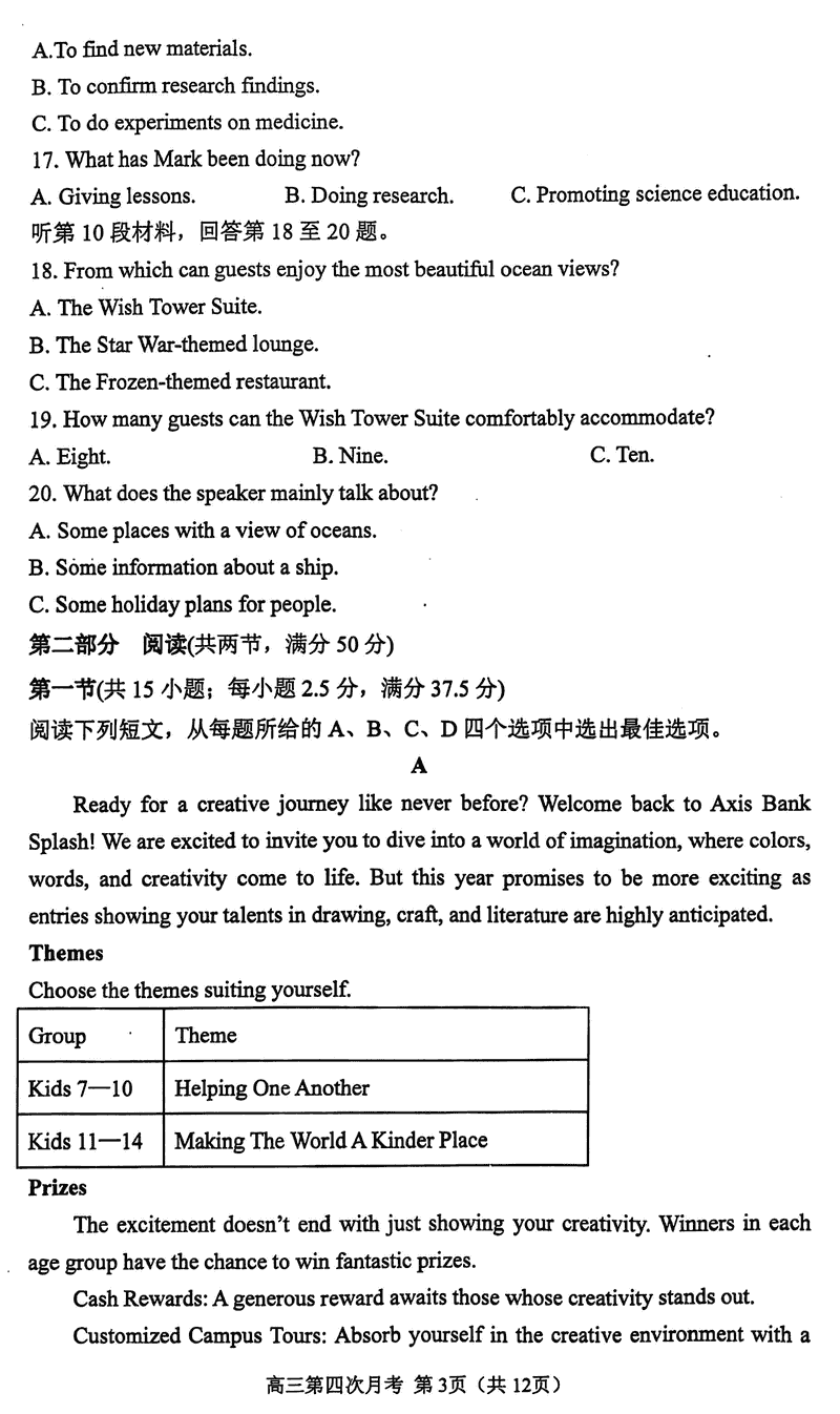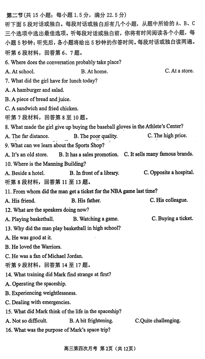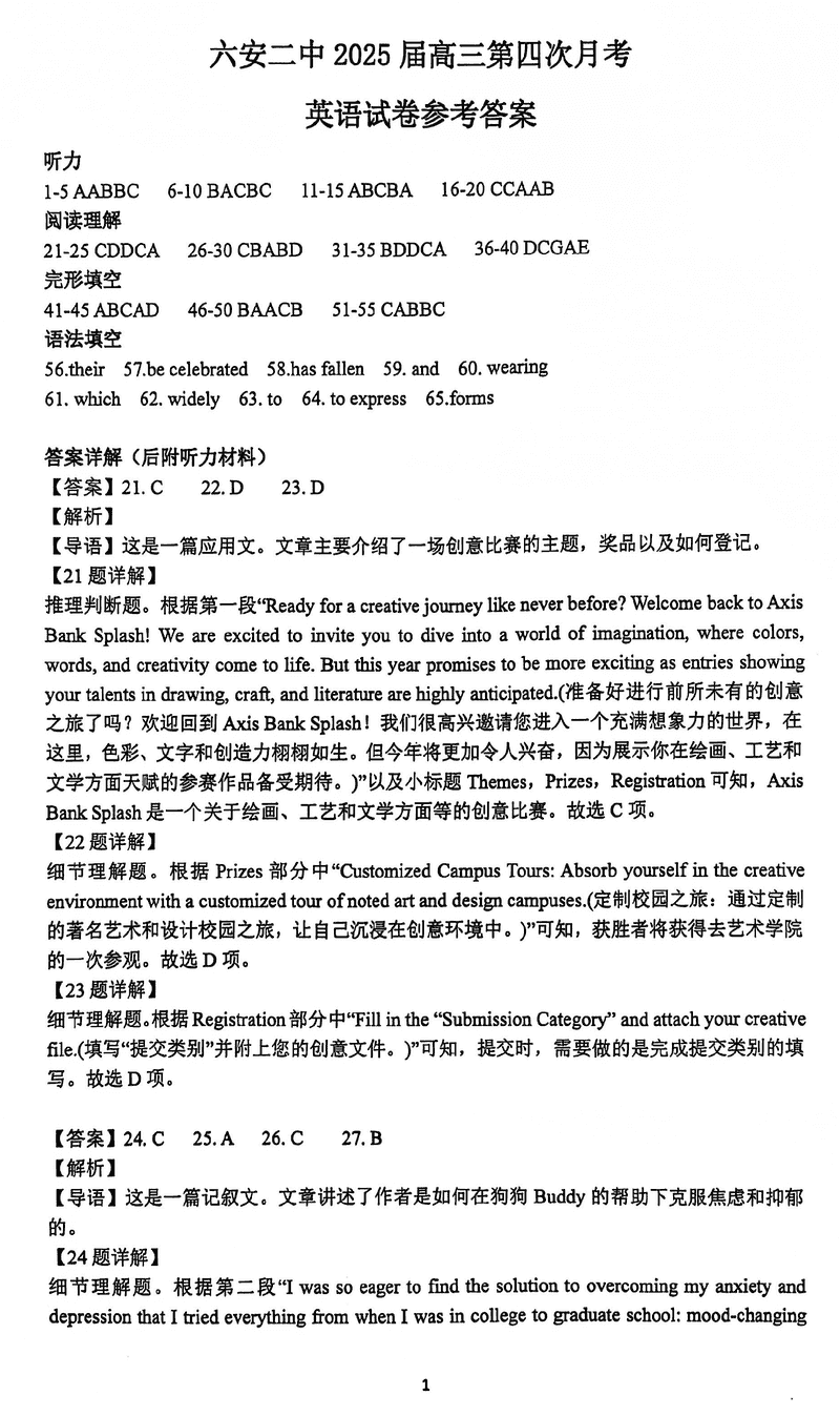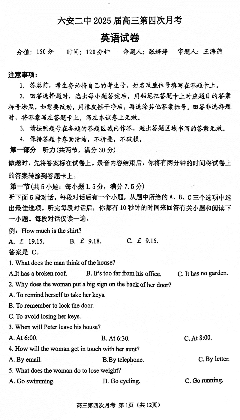 安徽六安二中2025届高三上学期12月第四次月考英语考试已于近日开考,为方便考生考后及时查看考试情况,查漏补缺、弥补不足,本文整理了试题答案解析相关信息!